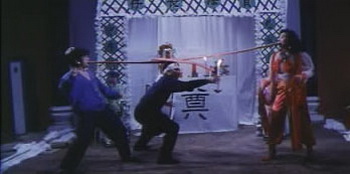 Tandis que Nat Chan et Charlie Cho parviennent à faire sourire d’être aussi bêtes, Shing Fui-On encore fringant se balade en chasseur de démons, les lunettes d’Invasion Los Angeles pour pister sa proie sur le nez, le brushing d’Elvis, la moustache de Magnum et l’épée de Musclor au côté, plumes, carquois et Perfecto sur le dos, sans vraiment dénoter cependant, comparé à une flopée de rôles auxquels il nous habituera (souvenons-nous de Blue jean monster).