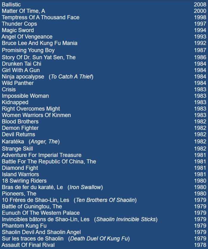 Mais l’homme a de l’ambition et veut devenir un réalisateur. Il effectue le premier pas en avant dans cette direction en 1968 en devenant l’assistant réalisateur de Chang Cheh (qu’il avait rencontré dès 1965 à l’occasion du tournage de The Butterfly Chalice) pour Golden Swallow. Il continuera à assister l’ogre tout au long des années 70, co réalisant The Water Margin, All Men Are Brothers et surtout Five Shaolin Masters et Disciples Of Shaolin. Mais ses débuts en tant que réalisateur, il les fera hors du giron de la Shaw avec le Wu Xia Pian Wrath Of The Sword. Par la suite, il réalisera d’autres films d’arts martiaux indépendants à Taiwan et Hong Kong comme Deaf And Mute Heroine, souvent considéré comme un de ses meilleurs films. Versatile, il s’adaptera aux modes du genre passant du Wu Xia Pian à la comédie Kung Fu sans difficultés.