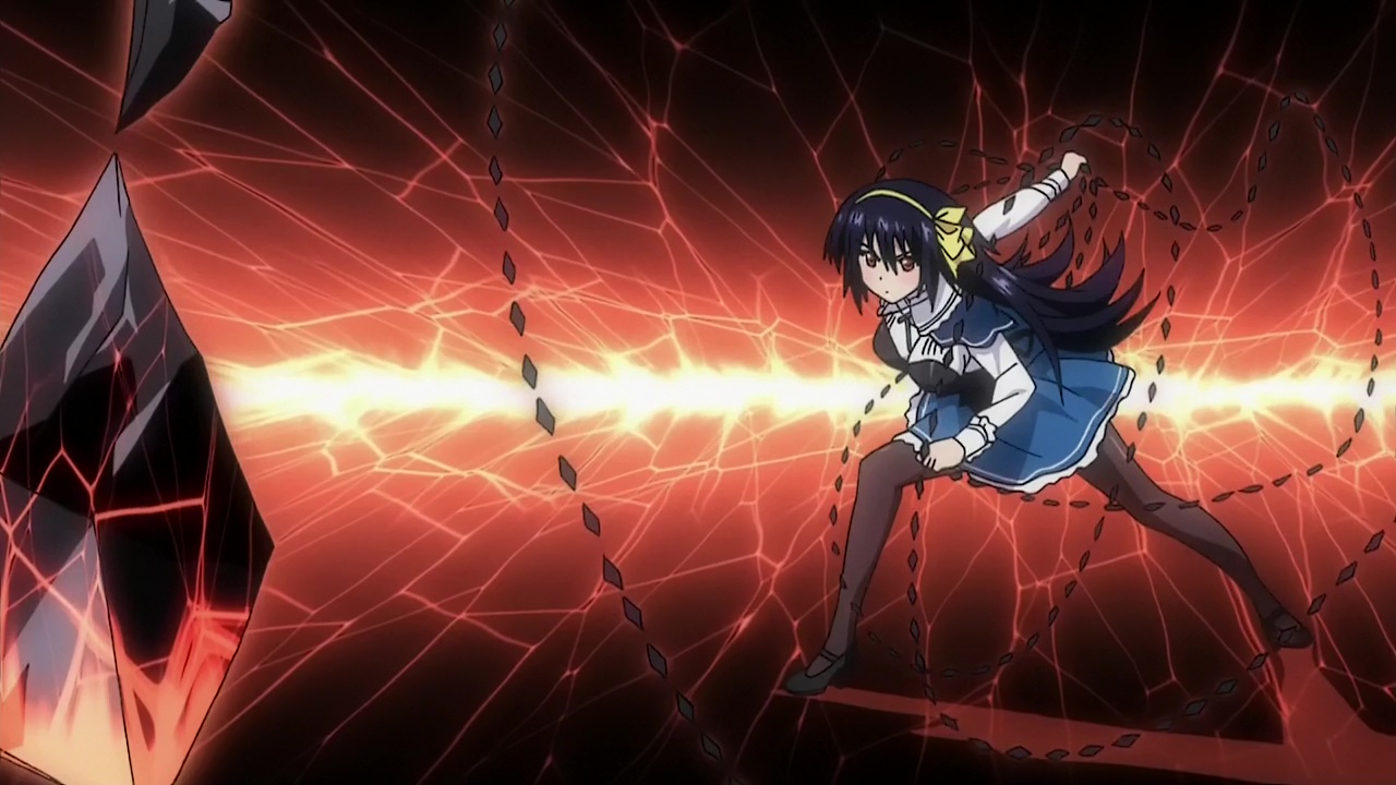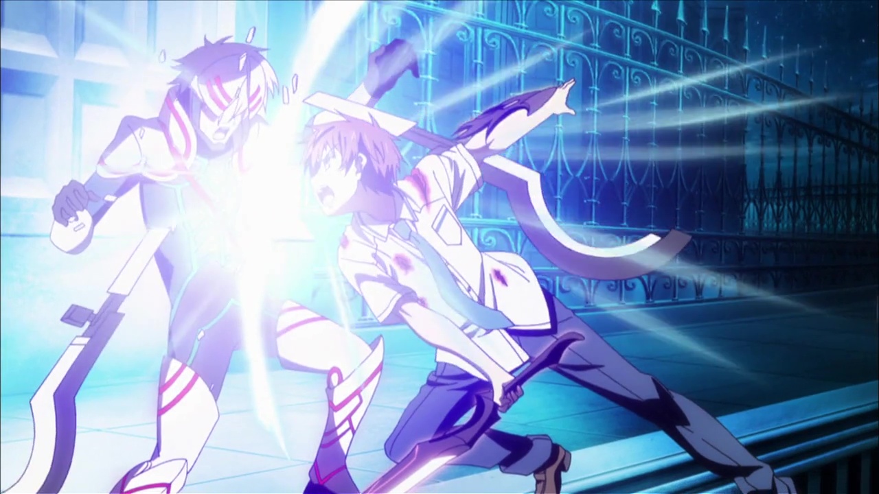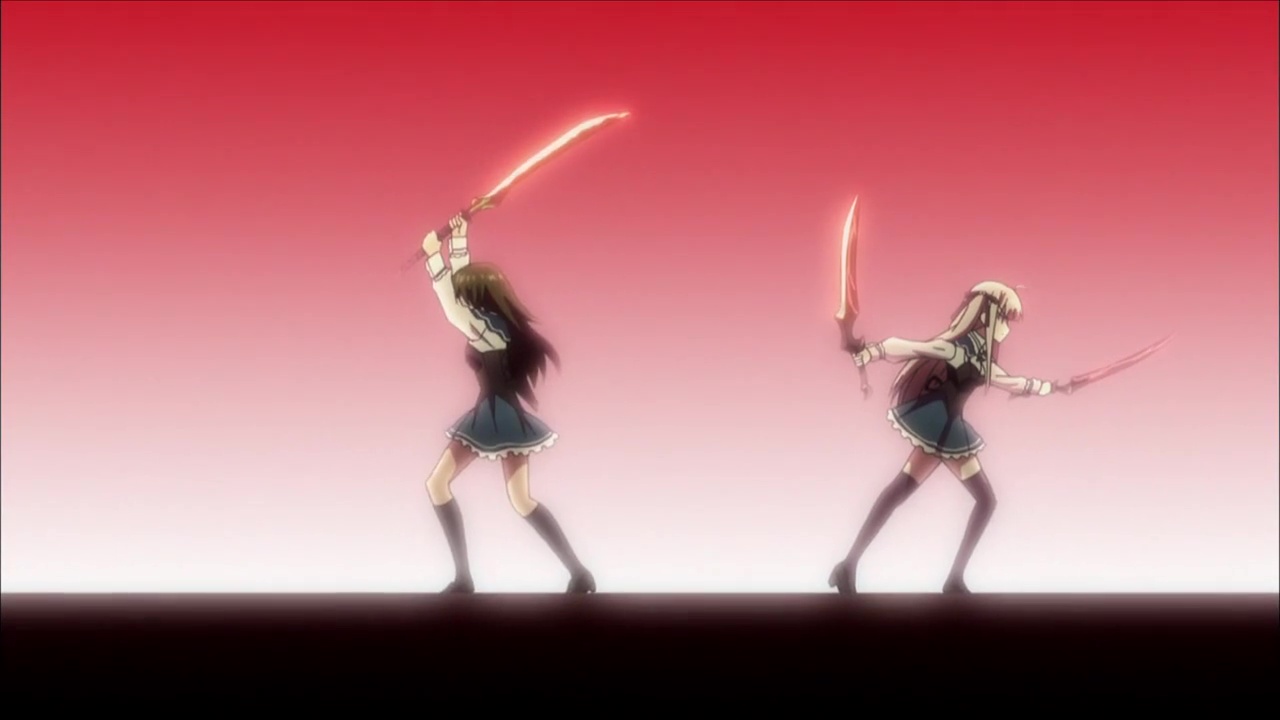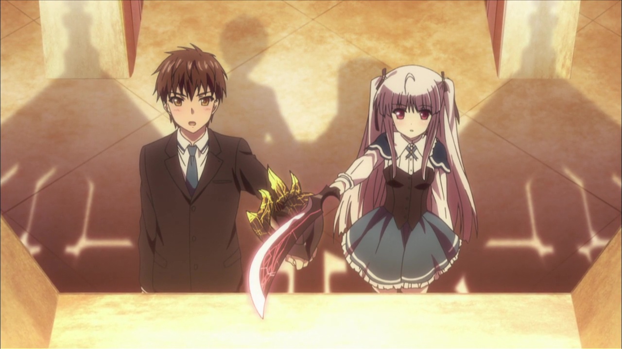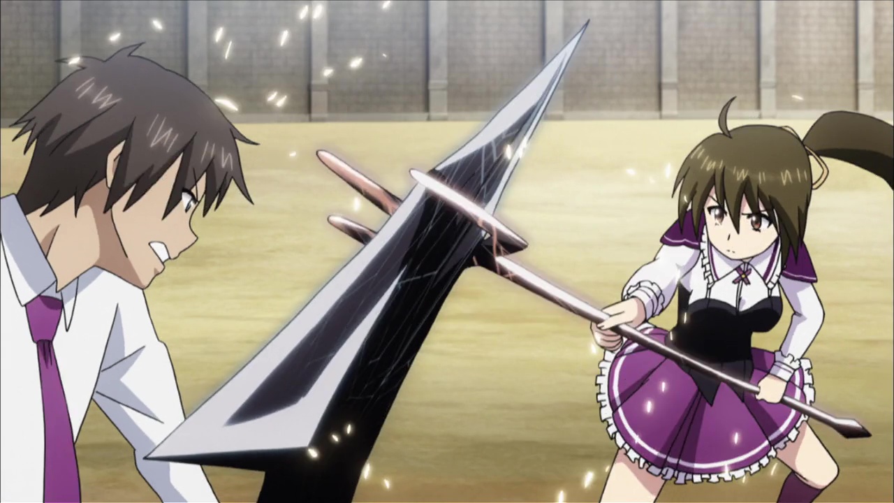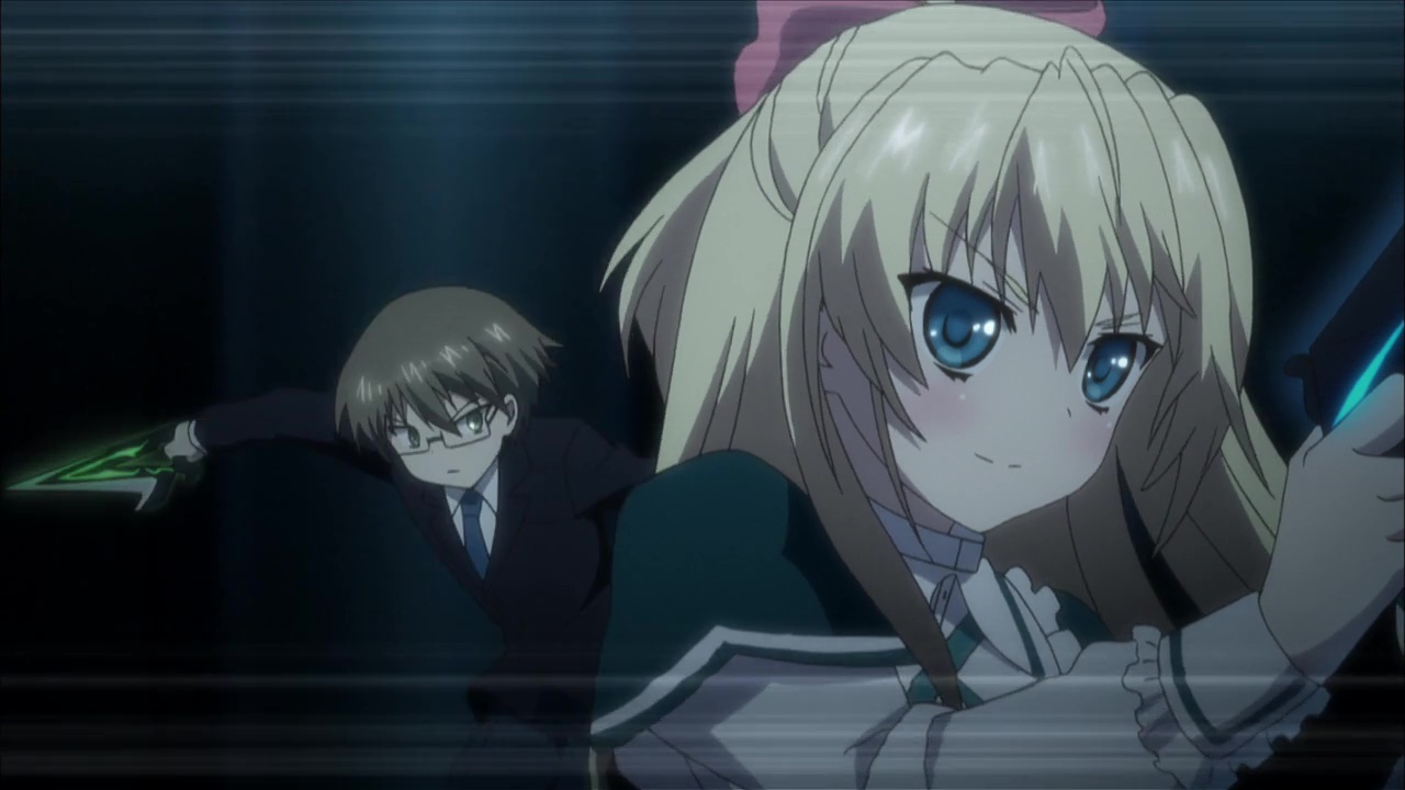 Apprentissage, formation de duo, combats, prendre du grade, apparition d’un grand méchant, combat final. Passé son concept et ces armes, Absolute Duo par contre se fait extrêmement classique. Mais réellement, les surprises sont peu nombreuses. Forcément, notre jeune homme va se retrouver en duo avec une fille, et de là, le spectateur un tant soit peu connaisseur peut imaginer les situations. Oui, on aura quelques sous entendus, on aura des malentendus, on aura une grande amitié, une histoire d’amour, et pour ne pas aider, tous les personnages sont clichés. Tôru, notre héros déjà, il n’est pas forcément très intelligent. Il nous le fait croire parfois grâce à son sens de l’orientation concernant les autres, mais quand il s’agît de lui, et ben bordel, une quiche ce mec. Une nana le regarde non-stop et lui ne voit rien venir. Pire, il mettra 12 épisodes à comprendre pourquoi son arme à lui, c’est un bouclier. Je vous spoile allez : il a un bouclier car son âme lui dicte de protéger les gens… OUI, 12 épisodes pour en arriver à cette conclusion que l’on remarque au final dés l’épisode 2.
