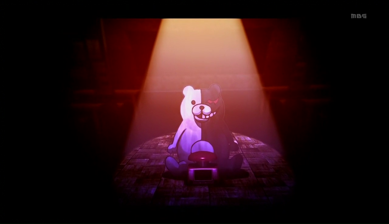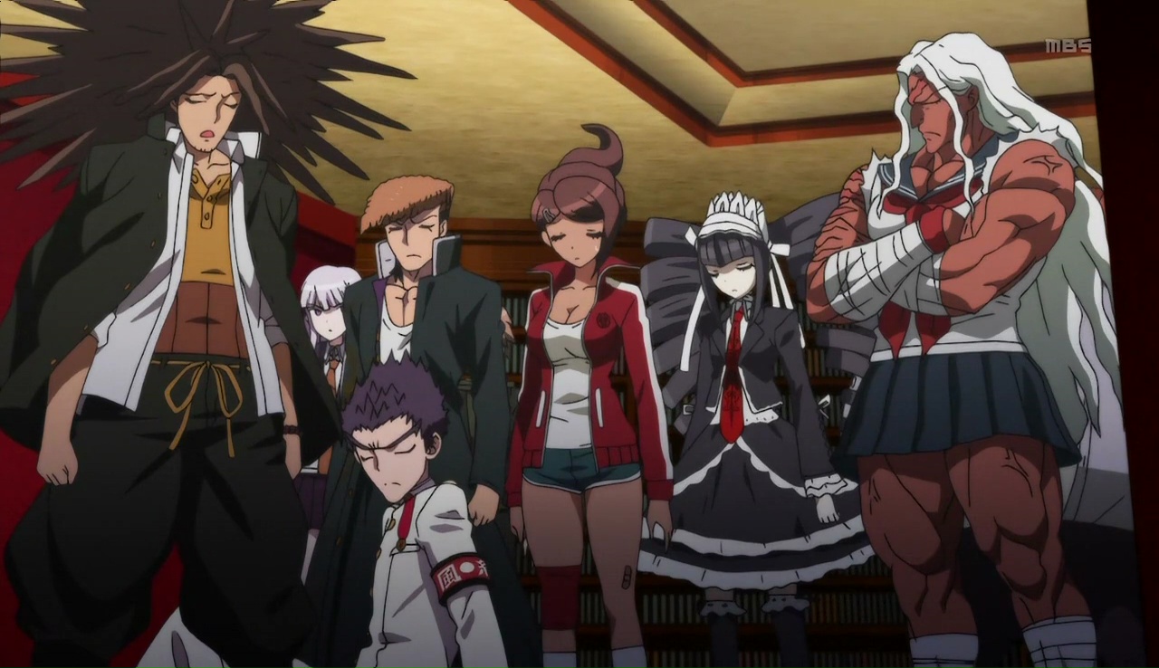 Des domaines au final vraiment particulier, puisqu’il y aura une idole, un biker, un héritier, une joueuse douée en bluff, un programmeur, un joueur de baseball, et Makoto donc, le lycéen chanceux, puisqu’il n’a pas de don particulier, mais a été accepté via un tirage au sort. La chance donc, purement et simplement. Sauf que dés qu’il franchit le pas de l’école, tout tourne mal, et il se retrouve avec les autres nouveaux élèves, prisonnier, les portes étaient fermées, l’entrée changée en lourde porte en acier, les fenêtres barricadées. Monokuma apparaît pour leur donner les règles : ils devront passer leur vie ici. S’ils veulent sortir, une seule solution : tuer l’un d’entre eux, sans que les autres ne découvrent l’identité du tueur. Ainsi, si un meurtre est commit, les survivants devront enquêter, trouver les indices, puis un procès a lieu où ils devront débattre pour trouver l’identité du coupable. Si le coupable est trouvé, il est exécuté de manière « créative ». Si les étudiants se trompent, le coupable peut quitter l’école, mais tous les innocents sont exécutés. Ah oui, et pour ne pas aider, Monokuma est un ours en peluche…. Voilà donc le point de départ ainsi que l’histoire basique de Danganronpa. Maintenant, qu’est ce que ça vaut en série animée ? Et bien là est une question bien difficile. Et encore une fois, le format de 13 épisodes semble ridicule et peu approprié. Une histoire aussi dense, six procès, 15 personnages, pas mal de secrets à découvrir dans l’école et sur le fin mot de l’histoire… On se doute dés le début que beaucoup de choses seront survolées, voir pas du tout présentes.
