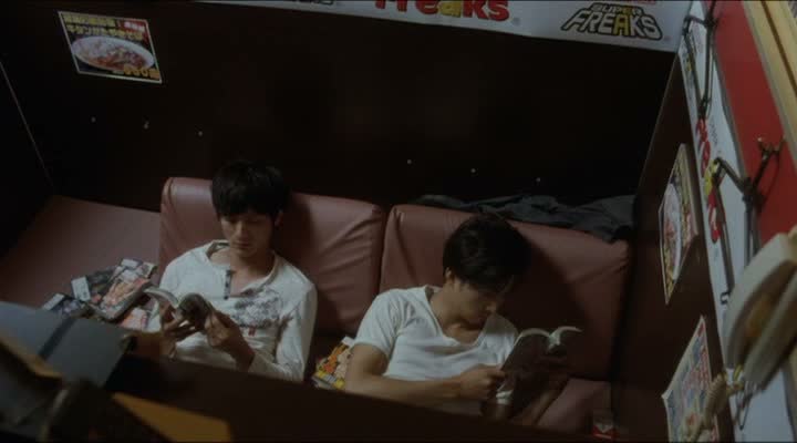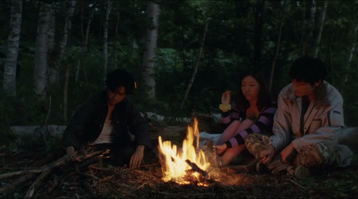 A Crowd of Three est un road movie contemplatif, se basant avant tout sur ses personnages. Il s’agît du second métrage de Omori Tatsushi après Les Murmures de Dieux en 2005. Cinéaste indépendant et original, Omori fait des films à sa façon, quitte à ne pas prendre le spectateur avec des pincettes. Pour son second film, c’est le cas, puisque dès la scène d’ouverture (un anniversaire), il ne nous prend pas par la main, comme pour nous forcer à rentrer dans une histoire qui a déjà commencée. Cela s’en ressent encore plus par la suite, avec de nombreux flashbacks venant développer les personnages, qui aux premiers abords, semblent un peu paumés, voir vides, un peu comme le spectateur, catapulté dans une aventure étrange. Nous faisons la connaissance de Kenta et Jun alors qu’ils sont jeunes adultes, au travail sur un chantier. Yuya, leur chef, abuse d’eux sans raison apparente, les ridiculise, les fait travailler plus pour un salaire de misère. Pour eux, c’est trop, et leur rencontre la nuit avec Kayo, alors qu’ils sortaient pour draguer, ne va pas arranger les choses. Le réalisateur ose un peu tout, passant d’une voix off à une autre, parfois d’un petit moment de vie à un autre, d’une critique sociale à des discussions amoureuses, donnant à son métrage un aspect varié, étrange, séduisant mais également fragile. Il nous propose de suivre des personnages qui, à l’image de son film, sont paumés, fragiles, sont des loosers.