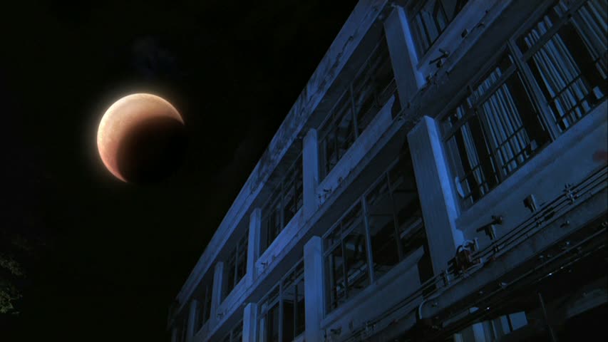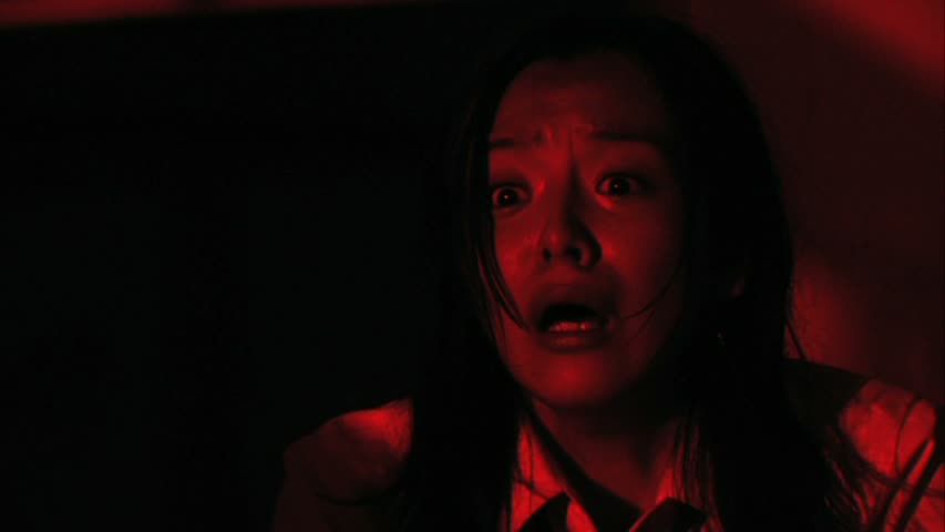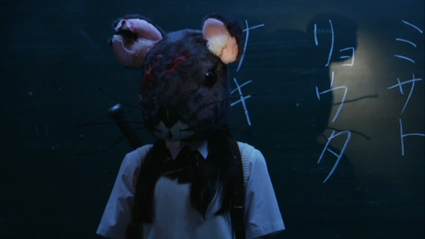 C’est à partir de là que Fukasaku parvient à la fois à nous surprendre, et à nous décevoir. La chasse à l’homme dans l’enceinte de l’école est plutôt rythmée, et même réussie en soit. Le tueur surgit un peu n’importe ou, comme dans n’importe quel slasher qui se respecte au final, et voir cette tête de rat surgir fait son petit effet. Sans trop rester sérieux, le tueur laisse à ses victimes une chance de s’en sortir, grâce à quelques épreuves, pouvant souvent paraître ridicule, et plongeant le film dans une ambiance assez bon enfant bienvenue. Arrêter un tir au foot ou devoir obtenir un score parfait au karaoké, voilà le genre d’épreuves que le tueur réservera à ses victimes. Bien entendu, les épreuves seront en général corsées afin que la victime n’ai pas beaucoup de chance de survies, mais tout cela rend extrêmement bien à l’écran. Les scènes se déroulent majoritairement de nuit, et le film bénéficie d’un éclairage bleuté réussi (on a droit aussi à du rouge de temps à autre). Pour couronner le tout, l’ambiance musicale du film est d’un très bon niveau et parvient à créer une petite ambiance, à la fois mystérieuse et hypnotisante lors de certains passages. Malheureusement, les bonnes choses ne durent pas, et malgré la courte durée du métrage (même pas 1h20), le film se casse un peu la gueule au fur et à mesure qu’il avance, et que les révélations commencent à arriver. Il est toujours difficile de rendre les motifs d’un tueur crédibles, surtout dans un slasher actuellement (enfin, déjà à l’époque d’or des slashers dans les années 80), et Black Rat n’échappe pas à la règle. Son postulat était simpliste, et ses révélations sont quelque peu foireuses.