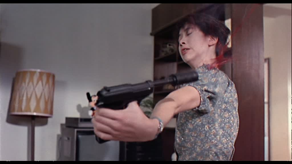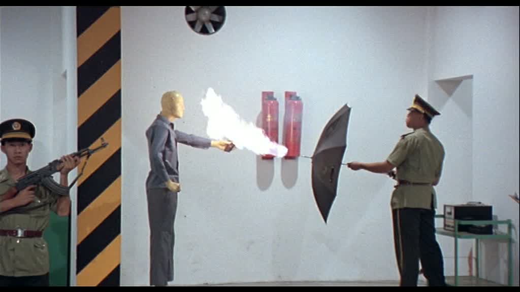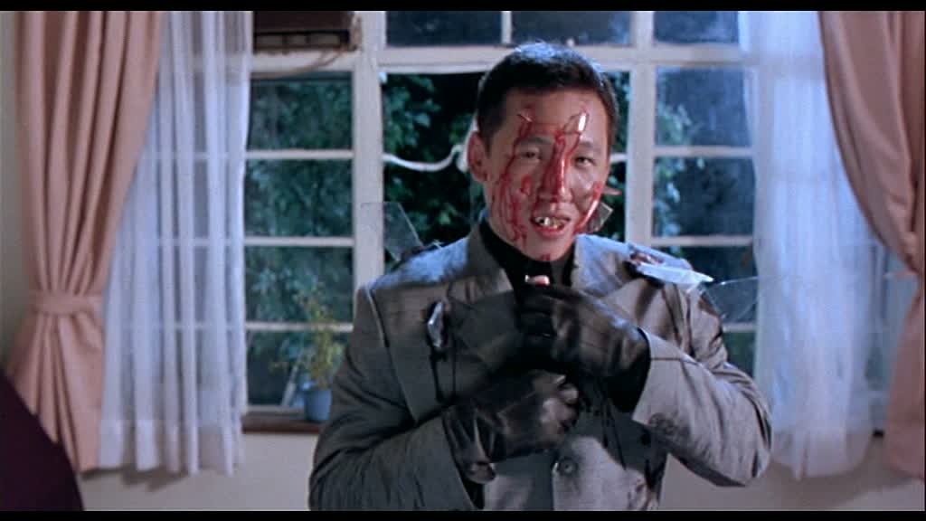 Le fan retrouvera donc tous les éléments à succès de la saga James Bond. Un méchant très méchant, un agent secret, la James Bond girl, un peu d’action, un complot, et bien entendu, des gadgets. Et il faut bien l’avouer, Stephen Chow fait très fort dans la première moitié de son métrage en parodiant tout ça à sa manière, en rendant le tout drôle, divertissant, et plutôt intelligent bien entendu, ce qui n’était pas une mince affaire. Si James Bond est un boucher, la James Bond Girl, jouée par Anita Yuen (Thunderbolt, Le Festin Chinois, Enter The Eagles), est un agent double qui doit en réalité l’éliminer. Le méchant, en réalité son employeur, est l’homme au pistolet d’or (oui, Goldfinger) avec une tenue pare-balles qui prête à rire. Dans ce monde où les gentils ne sont pas ceux que l’on croit (et donc idem pour les méchants), Q lui devient De Vinci, et ses gadgets sont à la hauteur de sa réputation. On aura la lampe solaire (qui ne fonctionne donc que s’il y a déjà de la lumière) ou le siège espion censé faire peur aux ennemis… Des gadgets hors du commun qui plairont à 007, puisqu’il pourra ainsi soigner son apparence, avec le téléphone qui fait rasoir, le rasoir qui fait sèche-cheveux, et d’autres. La première partie du métrage est un sans faute qui déclenchera un bon nombre de rires, entre ses éléments purement parodiques et les scènes que l’on s’attend à trouver, comme les scènes de dragues, ici doublées de tentatives d’assassinats extrêmement drôles (avec le pistolet qui tire à l’envers !).