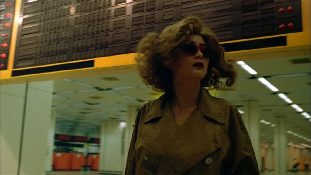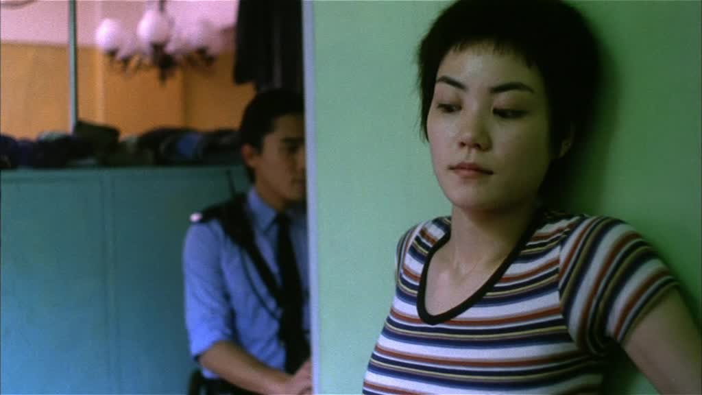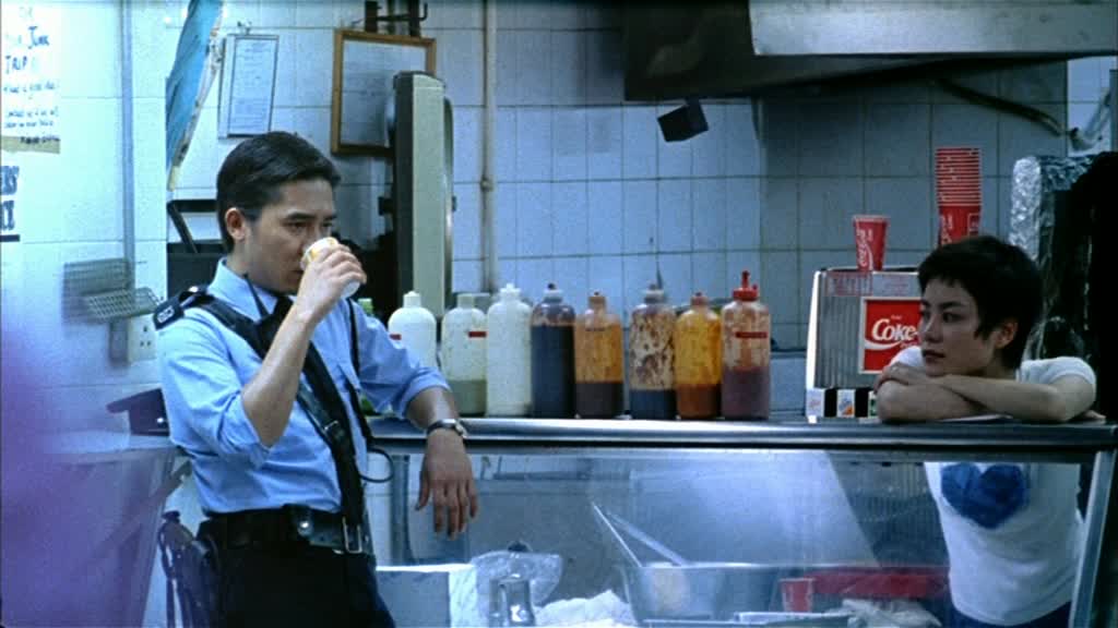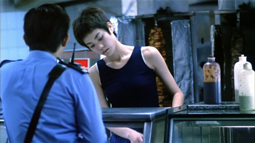 On nous propose donc cette fois-ci de suivre deux histoires, et donc, deux histoires d’amour impossibles, deux ruptures, deux façon de gérer les choses. La première met en scène Kaneshiro Takeshi (qui reviendra dans le film suivant du réalisateur), le matricule 223, flic, qui vient de se faire plaquer par sa petite amie, May. Il lui laisse un mois pour revenir, jusqu’au jour de son anniversaire, en achetant tous les jours une boite d’ananas, l’aliment préféré de May. Il ne le sait pas encore, mais son destin va croiser celui d’une jeune femme énigmatique, une fausse blonde vivant de différents trafics dont la vie ne semble pas simple. Tout les oppose, mais 223 va jeter son dévolu sur cette jeune femme, jouée par Brigitte Lin (son dernier rôle d’ailleurs avant qu’elle ne quitte le monde du cinéma), toujours vêtu de sa perruque blonde, de son impair, et de lunettes de soleil. Méconnaissable au possible, les deux trouvent sans doute un de leurs meilleurs rôles, si ce n’est le meilleur. La seconde histoire met en scène un autre flic, le matricule 633, joué par l’acteur fétiche du réalisateur, Tony Leung Chiu-Wai, qui lui aussi vient de se faire plaquer par sa petite amie hôtesse de l’air. Il va faire la rencontre de Faye, une jeune femme aux cheveux courts qui travaille dans un fast-food et qui va immédiatement tomber amoureuse de lui. Deux histoires à la fois si proches et si différentes, deux histoires baignant dans un humour parfois absurde mais totalement irrésistible et fonctionnant à merveille grâce aux talents des acteurs. Un homme aime une femme, et une femme aime un homme.