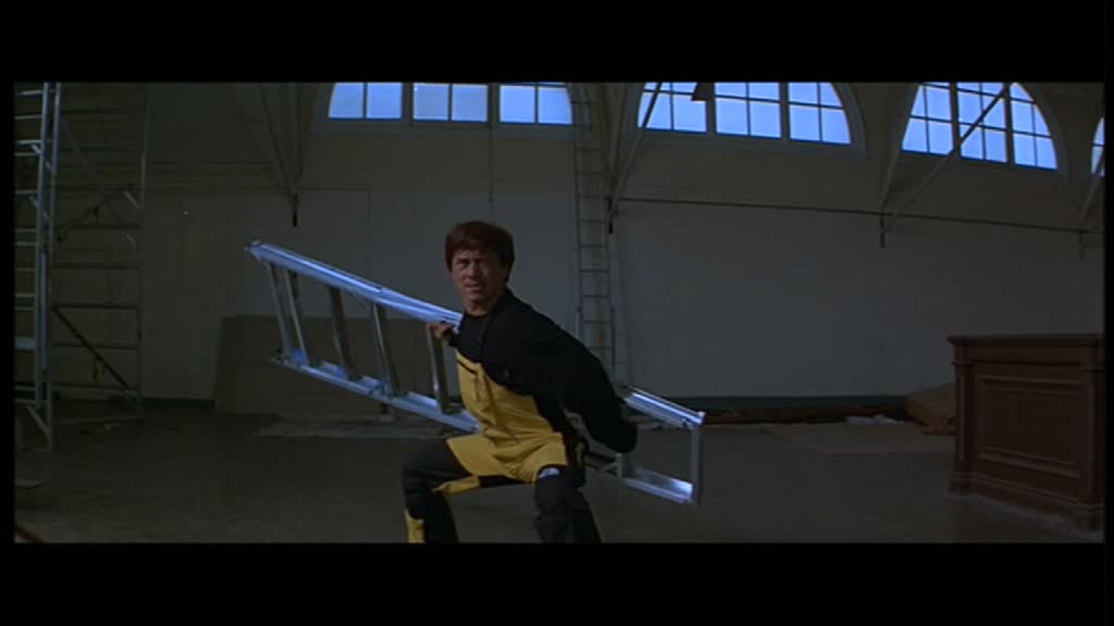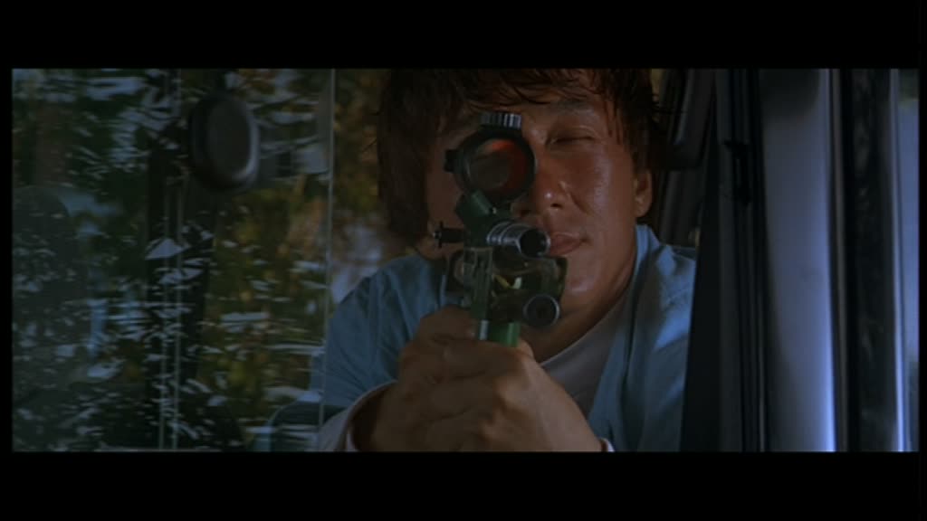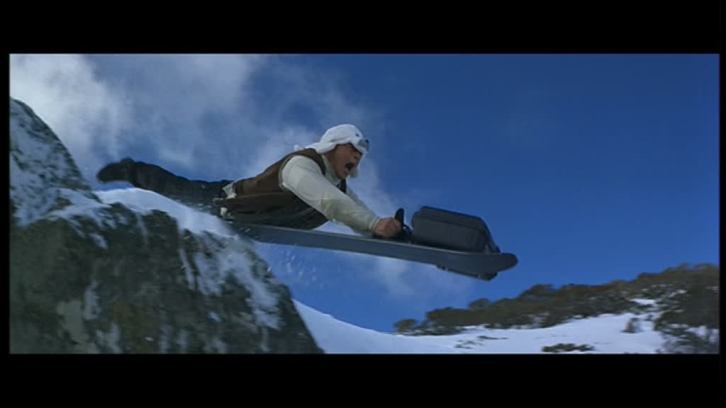 Contre-Attaque montre dès son ouverture qu’il sera moins efficace, moins drôle et moins intéressant que les trois premiers opus. S’ouvrant sur quelques scènes d’infiltrations pas vraiment passionnantes avec des gags pas très subtils (le coup du bonnet m’a tout de même décroché un petit sourire), le film nous lance après de longues minutes sa première scène d’action (une quinzaine dans la version courte, une vingtaine dans la version intégrale), très inspirée de l’univers de James Bond, avec une course poursuite dans la neige, en ski et snowboard. Jackie Chan aura beau toujours faire les cascades lui même, et Stanley Tong aura beau avoir fait du bon boulot sur les deux précédents films avec Jackie, le constat est triste, car à part la fin de cette scène, la mise en scène peine à intéresser et à mettre en valeur les différentes cascades, paraissant, à part pour le grand final de la scène, plutôt banales. On arrive d’ailleurs là à un des grands problèmes du métrage : sa mise en scène. Stanley Tong livre une mise en scène plutôt plate et inintéressante, qui ne nous livrera qu’un seul grand moment (un combat en milieu de métrage). Les différentes scènes s’enchaînent, le rythme n’est franchement pas excellent, et le montage n’aide pas, autant dans sa version courte que longue, qui abuse des fondus enchainés ou au noir pendant la première demi-heure, si bien que l’on se demande si Stanley Tong avait vraiment préparé son film à l’avance ou a attendu le montage pour voir si ce qu’il a tourné fonctionnait. Passé cette introduction peu convainquant, Jackie est envoyé en Australie pour poursuivre sa mission en s’approchant de la famille d’un des terroristes, en particulier de sa sœur (Annie Wu), et va, oh surprise, comme souvent se retrouver en plein milieu d’un complot qui va le faire passer pour un tueur (bizarre, comme dans le premier Police Story).