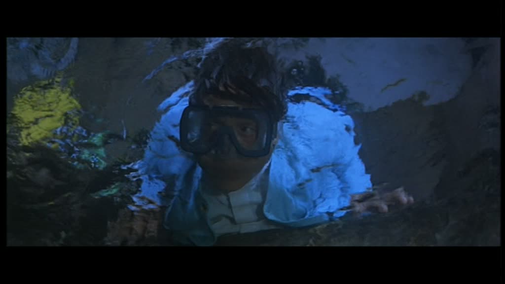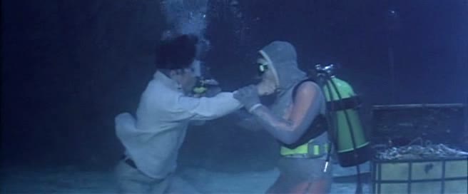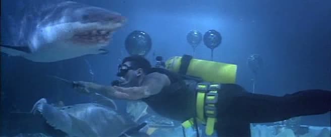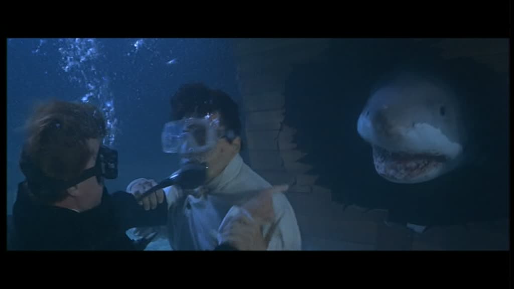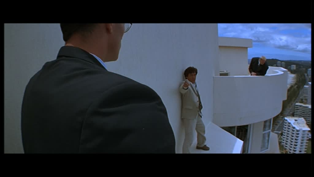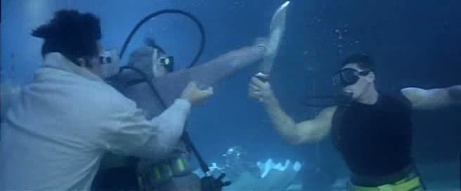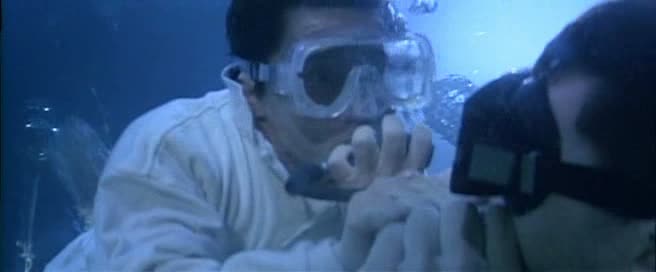 Arrivé en Australie, l’humour se fait encore plus lourd, et surtout, le film tente de se rapprocher encore un peu plus de l’univers de James Bond, en donnant à Jackie tout un tas de gadgets pour pouvoir continuer sa mission. Partie peu passionnante, on devra attendre un bon 50 minutes (une heure pour la version longue) pour enfin voir le premier combat du métrage, qui s’avère, il est vrai, très sympathique, mais bien trop court, et il faut bien l’avouer, dans son ensemble, Contre-Attaque ressemble bien plus à une vulgaire série B Américaine à destination du marché de la vidéo qu’à un film de Jackie Chan. Pire, pour un film d’action, l’action n’est que peu présente, et parfois ratée. A part ce rapide combat (environ trois minutes), le métrage reprend un rythme plutôt moyen à coups de complots, de « mais non en fait je suis gentil » ou « C’est mal de faire ça pour l’argent » avant de nous livrer un rapide combat final dans un… grand bassin. Idée intéressante, et au final, peu impressionnante, avec quelques ennemis et quelques requins. A noter que la scène a été écourtée de la moitié de sa durée (voir plus) dans le montage international, coupant ainsi les meilleures notes d’humour du tout le métrage (Jackie, saignant au doigt, se fait « sucer » – le doigt hein – par un peu tout le monde quand il a besoin d’oxygène, les requins n’étant pas loin, Jackie se servira également de son amie comme bouclier humain lorsque nécessaire…). Le film nous achève lors d’une cascade finale (reprise dans 2 Fast 2 Furious) sur-découpée au niveau du montage. Contre-Attaque, autant dans sa version courte peu intéressante que dans sa version intégrale incroyablement trop longue, est une grosse déception, et marque bel et bien le début de la fin pour Jackie Chan, ce que confirmera l’année suivante le tout juste sympathique Mister Cool et le désastreux Rush Hour en 1998. Triste pour un film se voulant être Police Story 4.