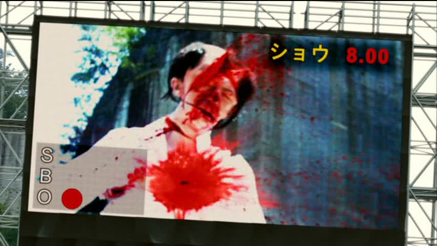 Mais la sauce prend, et si le baseball en lui même n’arrive que tardivement dans le récit (il faut bien attendre 50 minutes avant de voir le match commencer), on rigole pleinement devant le métrage proposé, et la galerie de personnages assez haute en couleur. Entre les gardiens de prisons nazis, l’équipe adversaire constituée de femmes qui prennent du plaisir à tuer pendant le jeu pour marquer plus de points, l’expert en arts martiaux, le jeune peureux qui ne sait pas jouer, on a l’embarras du choix. Si bien que lorsque la partie commence, après 50 minutes de délires, on est bien content de voir que le film ne nous laisse pas tomber et va encore enchaîner pendant 50 minutes les délires sur le « terrain », ou les idées les plus folles se succèdent, parfois avec une grosse pointe de rouge sang. Malheureusement, tout n’est pas rouge dans le film, tout n’est pas beau. Outre des effets numériques discutables (et parfois bien hideux, il faut l’avouer, même pour une comédie potache et sanglante), le film se voudra parfois trop sérieux, comme lorsqu’il abordera le traumatisme de Jubei et sa décision d’arrêter le baseball. De plus, vers la fin, Sakaguchi ne peut pas s’empêcher de montrer qu’il est chorégraphe et sait se battre, nous donnant quelques rapides scènes de combat plutôt inutiles, avant d’enchaîner sur un final qui, bien que possédant de bonnes idées, s’avère partiellement raté. Dommage, mais Dead Ball est encore une production parfaitement recommandable.