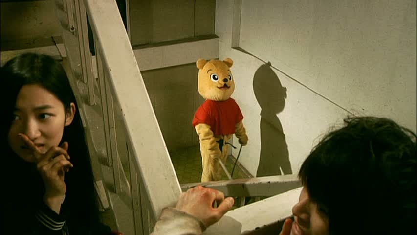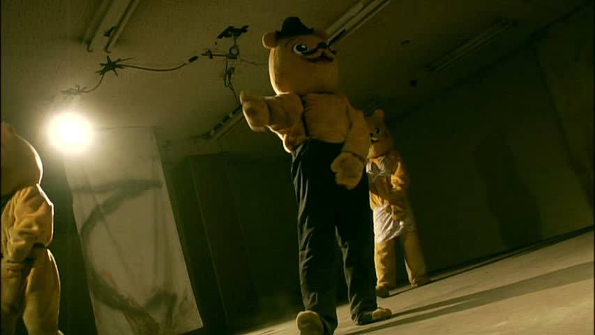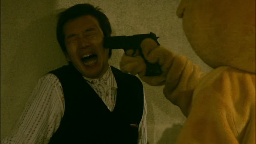 Niveau mise en scène, il n’y a rien de spécial à dire, puisque les décors, l’éclairage et le style sont exactement les mêmes que pour le premier film. Rien de bien neuf à l’horizon donc, c’est filmé sans éclat de génie, certaines scènes fonctionnent, à d’autres moments, le réalisateur ne parvient pas à cacher son absence de budget et son nombre de décors très limité. Mais ça, on s’en moque un peu, d’autant que l’on a vu tellement pire dans le milieu du V-Cinéma. Là où Death Tube 2 peut surprendre, c’est arrivé à la moitié du métrage. Si le ton mélange toujours humour, scènes plus dramatiques et dures et moments violents, on retrouvera une épreuve à dilemme comme dans le premier métrage. Après la femme violée du premier donc, deux des joueurs se retrouvent devant un dilemme : se suicider pour sauver la vie de son enfant. Une scène dure qui surprend surtout qu’elle est située après des passages beaucoup plus bon enfant où les personnages passent des épreuves, confiants, avec le sourire. Mais passé cette scène, le film prend un virage à 180 degrés, ce qui n’est pas forcément un mal, tout ce qui concerne les énigmes ayant été vu pendant deux heures dans le film précédent. Non, là les survivants vont se rebeller, et tout faire pour pouvoir s’enfuir. Là, on aura droit à quelques nouveaux décors, aussi pauvres que les précédents, avec une pauvre cage d’escalier et quelques nouveaux décors vides. Et le film laisse par la même occasion totalement de côté l’aspect violent pour alterner simplement dérision et moments dramatiques. Adieu donc les épreuves débiles aux fins violentes, on se retrouve devant une « course poursuite » où les survivants arriveront à capturer un des oursons, et ainsi on en apprendre enfin un peu plus sur le jeu Death Tube. Un peu, mais pas trop non plus, beaucoup de choses restants dans l’ombre. Mais le fait de voir plus clairement cette organisation et les hommes derrière les masques apporte indéniablement du neuf.