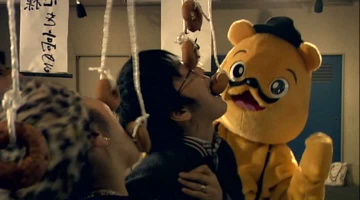 Saw n’en finit pas de faire des émules. Bon nombre de films venant d’un peu tous les pays voient le jour en essayant de surfer sur la fameuse (en terme de box office, car en terme de qualité, ce n’est plus là depuis la fin de troisième opus) saga. Même au Japon, Saw connaît des copies, ou plutôt fausses copies avec les deux Death Tube. Fausses car les films mélangent souvent le premier et second degré. Death Tube donc, c’est un site, un peu comme Youtube, qui n’est en ligne qu’une semaine par an, qui est une plate-forme mettant en ligne des vidéos atroces ou des victimes sont tuées en direct. Pas mal d’internautes connaissent le site et regardent, par curiosité totalement malsaine. Les tueurs, qui capturent leurs victimes et les enferment dans des salles pour leur faire subir une série de jeux (en général assez grotesques), sont déguisés en… ours en peluche à l’apparence tout mignonne, avec une voix toute mignonne également. Un groupe d’individus se réveillent alors dans une pièce, et se rendent rapidement compte qu’ils sont en live sur internet, et qu’ils font parti du nouveau jeu Death Tube. Une série d’épreuves les attend, ou ils vont devoir redoubler d’intuitions et d’astuces pour y arriver et ne pas perdre la vie. Pour ce film très étrange et surfant donc sur le succès de Saw, on retrouve à la réalisation Fukuda Yôhei, réalisateur des très sympathiques Onechanbara (un film déjà fauché, mais adapté d’un jeu vidéo) et Tokyo Gore School (également sympathique, bien que rapidement répétitif), et par la suite de Kotoribako. Ici, c’est encore plus fauché que d’habitude. Le décor se limitera à plusieurs pièces, identiques, où se trouvent chaque participant, et une grande salle commune. Niveau personnages, il n’y aura que 8 personnages, les participants au jeu, et les tueurs, toujours cachés sous leur costume d’ours en peluche. Economie de budget, de figurant, un seul décor, et c’est parti pour l’aventure.
