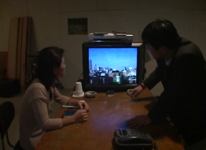 Le support est immédiatement moins visuel (dans le sens où un simple DVD n’a pas le même effet, du moins pour moi), mais quoi qu’il en soit, Den-Sen commence immédiatement. Une équipe de trois journalistes reçoit un DVD avec un message d’avertissement, et l’assistante de l’équipe va alors s’y intéresser, vouloir faire un reportage dessus, et perdre la vie. Les deux autres de l’équipe, le réalisateur (joué par Jomoto Daisuke) et le caméraman (joué par Nakamura Nobuhiro) vont vouloir éclaircir l’histoire, découvrir la vérité derrière la mort de leur amie, et vont donc mener l’enquête sur le DVD maudit. Une trame simple, qui n’ira pas plus loin, le métrage prenant la plupart du temps la simple trame d’une enquête, où les personnages vont aller d’indices en indices. Le film ne durant que 1h19, l’ensemble passe très bien, et on a vite envie d’en savoir plus sur les secrets que renferment cette vidéo maudite. Le début nous fait croire à du sensationnel, avec un fantôme apparaissant sur la dernière vidéo filmée par la défunte, puis c’est finalement une enquête très terre-à-terre à laquelle le réalisateur nous invite. Rien de sensationnel, juste quelques recherches, des interviews, quelques révélations. De la recherche de l’expéditeur à l’interview du médecin d’une victime jusqu’à la recherche du lieu figurant sur la vidéo maudite, Fukui Shozin se refuse les effets chocs, les apparitions à outrance. À ce niveau, le métrage fonctionne un peu à la manière de Ring, puisqu’il ne cède jamais aux effets faciles et préfère soigner le reste. C’est tout à son honneur.