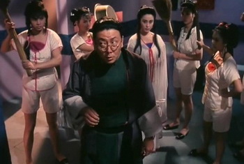 Le film jour donc à fond la carte du comique débile avec des gags souvent très cons, très axés en dessous de la ceinture, avec une fois de plus un Billy Lau dans un rôle sur mesure pour lui, celui d’un apprenti taoïste bien débile, mais surtout passionné par les atouts sexuels féminins. Il va par exemple, via un sort de magie, envoyer son esprit dans une savonnette histoire de pouvoir être frotté contre la douce peau nue de jolies demoiselles. C’est très très con, parfois un peu scato (le coup des excréments sur lui) mais ça fonctionne même si comme d’habitude, si on n’est pas un minimum préparé, Billy Lau peut rapidement devenir irritant d’autant plus que c’est un festival durant tout le film.