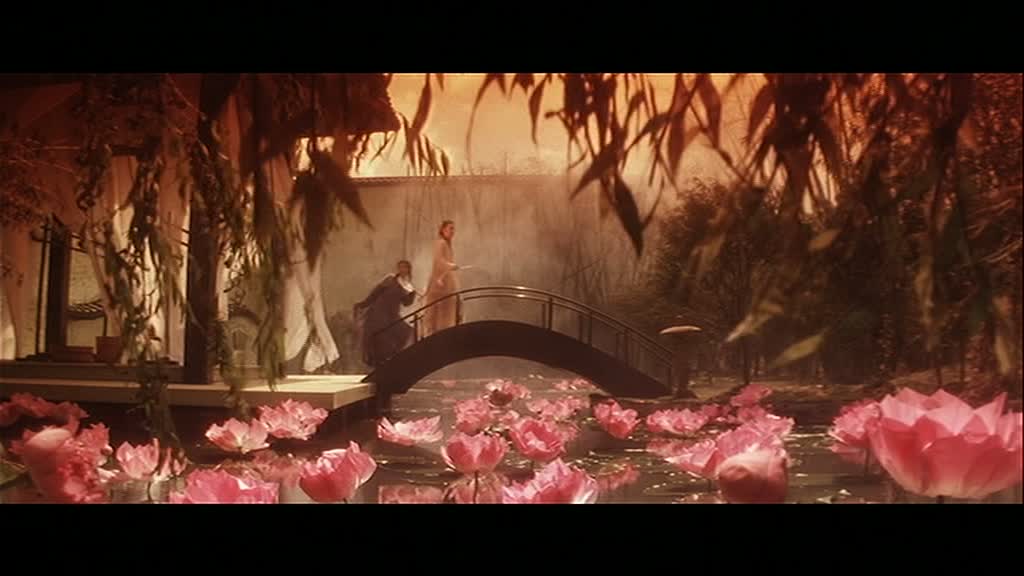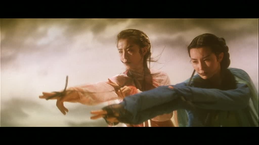 Dès la magnifique scène d’ouverture, Tsui Hark pose le ton. Les décors sont magnifiques et reconstituent parfaitement l’époque, ceux-ci baignent souvent dans des couleurs fantaisistes du plus bel effet, rappelant parfois justement Histoires de Fantômes Chinois. Bleu, violet, rose, l’univers est coloré, parfois un peu kitch, mais s’inscrivant à merveille dans le côté « faux » instauré par l’histoire (la demeure des deux serpents n’est qu’une illusion créée pour les humains après tout) et le côté poétique certain de l’histoire. On pourra également dire que les deux seuls vrais personnages humains de l’histoire, un moine Taoïste et un jeune homme un peu niais, font forcément penser à Leslie Cheung et Wu Ma dans Histoires de Fantômes Chinois encore une fois. Et sous ces airs de film fantastique et fantaisiste, Green Snake est, comme le film précité, une romance. Jamais Joey Wong et même Maggie Cheung n’avaient été sensuelle à l’écran. Tsui hark les filme avec grâce et élégance, rendant chaque apparition sensuelle, et même érotique, sans jamais verser pourtant dans la simplicité et dans le plan facile. Ce qui correspond parfaitement aux deux personnages, complexes et intéressants. Le Serpent blanc, Joey Wong, rêve d’être humaine, de connaître l’amour, elle veut spirituellement s’élever au même niveau que les humains, et elle jettera son dévolu sur un jeune homme un peu niais, mais gentil. Alors que le Serpent vert, Maggie Cheung, sera jalouse, voulant tout partager avec sa sœur, et ne comprenant pas les émotions, purement humaines, qu’elle arrive à ressentir.