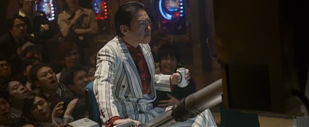En plus d’apporter un développement intéressant des personnages fort appréciable pour un film se voulant à grand spectacle, Kaiji 2 met les bouchées doubles au niveau des épreuves, c’est à dire finalement ce qui nous intéresse le plus dans le métrage. Là où le premier nous proposait trois épreuves, réussies bien que parfois entrecoupés de moments dramatiques inférieurs, ce second film ne nous propose que deux épreuves. La première est un jeu relativement intéressant, bien que n’occupant même pas dix minutes du métrage : le jeu de la princesse, où il s’agît de faire confiance, ou pas. En cas d’échec, la mort, pure et simple. Bien entendu, là n’est pas le gros moment du métrage, puisque les personnages passeront plus d’une heure rien que sur une machine à Pachinko géante, dotée de plusieurs sécurités et d’autres saloperies pour s’assurer que personne ne gagnera jamais. Quand ils seront sur cette machine, le film se transformera quelque peu en sorte de Ocean’s Eleven, avec des trucs toujours plus gros pour toujours battre la machine. Les rebondissements s’enchaînent à vitesse grand V, peut être même parfois trop, mais c’est ça aussi l’esprit manga auquel il faut adhérer dés le départ pour pouvoir apprécier un métrage tel que Kaiji.