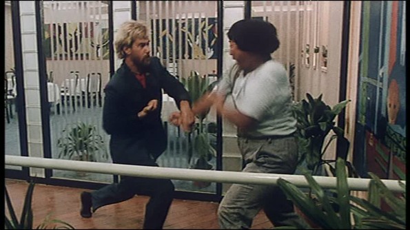 Le casting s’étoffe donc de nouveaux personnages, avec des têtes pas inconnues, comme Rosamund Kwan qui prend la relève de Sibelle Hu, devant la proie du groupe. Rien ne change, le groupe ayant encore recourt à des stratagèmes fous afin de profiter du corps de la belle, que l’on apercevra par la suite dans deux films de Jackie Chan (Armour of God et Project A2). John Sham, absent du film précédent alors qu’il faisait parti intégrante de la bande dans Winners and Sinners (Le Gagnant), revient dans un nouveau rôle, qui deviendra rapidement un nouveau souffre douleur. On pourra noter également une rapide apparition amusante de Michelle Yeoh dans le rôle d’un instructeur de karaté. La partie humour du métrage remplit donc une nouvelle fois sa mission, on s’amuse une nouvelle fois à suivre la bande, malgré quelques gags fonctionnant moins que d’autres (normal, après trois épisodes reprenant la même formule). L’action quand à elle est belle et bien au rendez vous, une nouvelle fois. Passé la première demi-heure, Chan et Biao refont donc leur grande apparition dans la saga, épaulés par Andy Lau (que l’on reverra dans l’opus suivant, Lucky Stars Go Places) et nous livre un combat phénoménal où l’on retrouve toutes les têtes que l’on aime. L’on retrouvera en effet Philip Ko Fei, mais également Dick Wei, qui affrontera une nouvelle fois Jackie Chan, comme dans l’épisode précédent. Mais ce rapide combat mi parcours n’est rien comparé à ce qui nous attend lors du final.