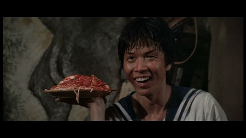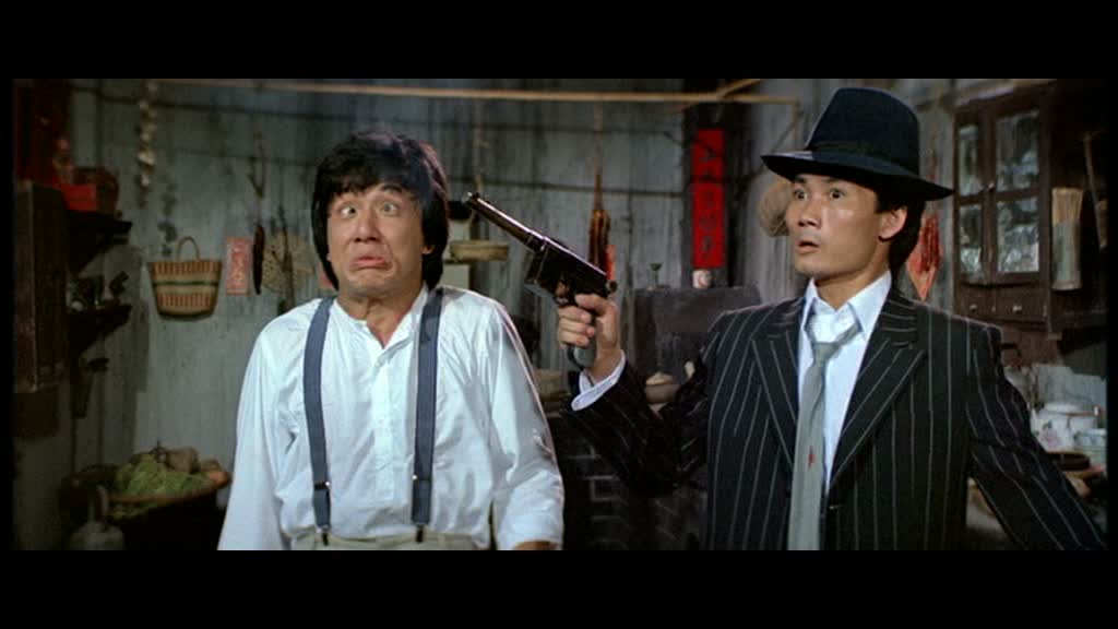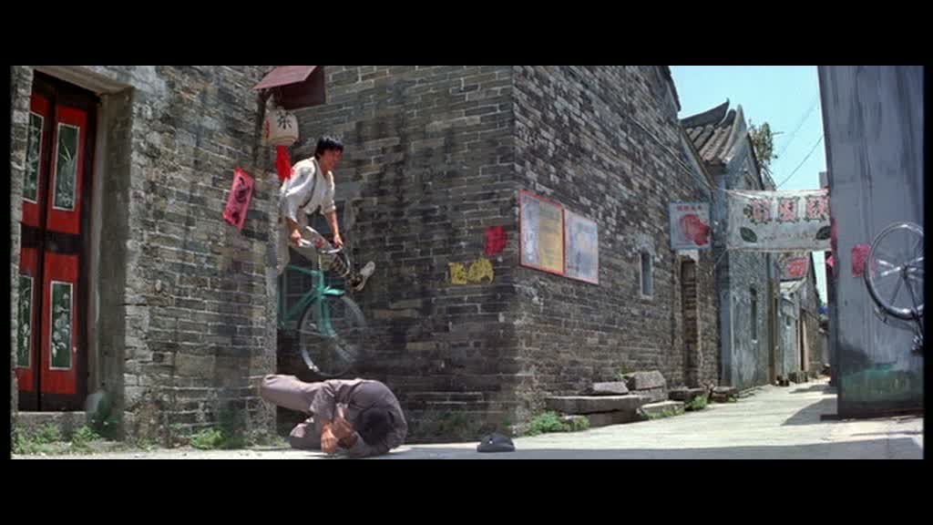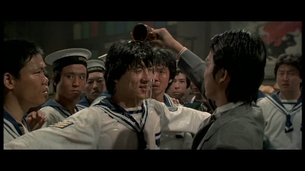 L’aspect comédie est totalement réussi, avec les différentes engueulades entre ses trois parties, les petites disputes en pleines courses poursuites, ou encore l’entraînement imposé à Dragon et son équipe lorsqu’ils rejoignent la police par obligation. L’humour est bon enfant et fonctionne alors à merveille, entre la scène des douches, l’entraînement à la grenade, où quand les personnages sont punis et doivent réciter une phrase mille fois. Bien entendu, Jackie Chan oblige, l’humour rejoindra même les grandes scènes d’action, avec quelques grimaces et situations pour le moins réussies. Les trois compères vont bien entendu finir par s’allier afin de lutter contre la menace pirate ! Outre son aspect humour omniprésent et encore plus souligné par la musique (la baston dans le bar au début avec la musique qui se lance, ou encore les morceaux utilisés lors de la culte poursuite en vélo), Jackie Chan ne se moque pas de nous et nous livre des cascades dont il a le secret et des scènes de poursuites ou des combats tout simplement énormes, et ce dés le début du métrage. Le film est parsemé de moments cultes difficilement oubliables. Comment ne pas penser au combat de début dans le bar entre la police et les marins, blindée d’humour avec le coup des spaghettis, à cette poursuite en vélo regorgeant d’idées énormes et drôles au possibles, ou bien entendu au combat final.