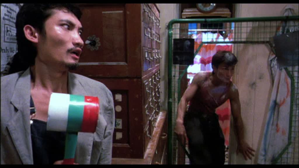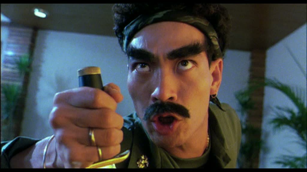 Mais ça, c’est sur le papier seulement, car des quatre premiers opus de la saga (je n’ai pas encore vu la suite au moment où j’écris ces lignes), Yes Madam est bel et bien l’opus le plus faible. Et en plus, le plus anecdotique. Car malgré son casting martial impressionnant (tout comme son casting comique), ainsi que son attachement à la saga Le Sens du Devoir, proposant des films bourrés d’action et même parfois assez violents, Yes Madam fait tout l’opposé, et la majeure partie du temps, ne nous propose qu’une gentillette comédie. Pourquoi pas, des films devenus cultes comme Le Flic de Hong Kong la même année faisaient déjà ce choix et nous divertissaient. Sauf que dans Yes Madam, la sauce ne semble jamais vraiment prendre. Pendant pratiquement une heure, nous suivons d’un côté Michelle Yeoh et Cynthia Rothrock menant leur enquête, et donnant quelques coups lors de rares scènes, notamment l’ouverture et la scène de l’aéroport, ou encore la scène du club contre Dick Wei. Sans le savoir, ces scènes très courtes ressemblent un peu à une mise en bouche de ce que le final nous réserve. Ces courtes scènes nous montrent que les deux jeunes actrices ont du talent à revendre, et tant mieux. Car à côté de cette enquête qui ne va pas franchement avancer, le scénario nous propose de suivre trois petits arnaqueurs pas franchement doués, que sont Tsui Hark, Mang Hoi et John Sham. Si Mang Hoi s’en sort relativement bien, on ne pourra pas dire la même chose de ses deux amis, qui vont continuellement amener dans le métrage un humour assez lourdingue qui ne prend jamais. Tsui Hark se fait plaisir certes, mais énerve rapidement, mais ce n’est rien à coté de John Sham, qui s’il parvient à amuser dans d’autres films (Le Gagnant) ou même parfois à surprendre (Pedicab Driver), irrite ici plus qu’autre chose.