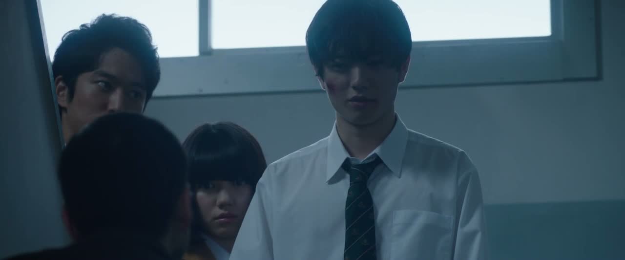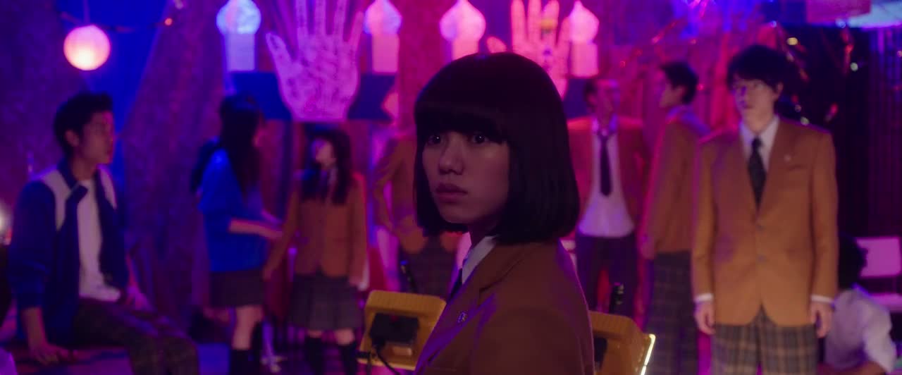 Prenant son temps, comme souvent, Miike étale son film sur 2h10 quasiment, et découpe clairement son film en trois parties. La première, la plus calme, sert bien évidemment à poser les différents personnages, l’environnement, et à nous montrer Hasumi, ou du moins, à nous montrer le masque qu’il porte tous les jours. Aux premiers abords, un adulte respectable, enseignant modèle aimé par ses élèves, enseignant l’anglais de manière plutôt ludique (que j’aurais aimé avoir un prof comme ça… du moins au début), cherchant toujours la meilleure solution pour régler les soucis. Il est proche de ses élèves, il les aide même dans les épreuves les plus difficiles (gérer une situation ou un collègue abuse d’un élève). Pour ses collègues, c’est un ange également, trouvant toutes les solutions idéales pour régler les conflits, s’investissant à fond dans son travail. Miike prend son temps, peut être même un peu trop dirons certains, mais honnêtement, cela passe plutôt bien, et cette première partie fonctionne bien, jusqu’à ce que finalement, Hasumi fasse tomber le masque, à la fois auprès des spectateurs que de certains des personnages. Alors que l’on s’attendait à un bête jeu de massacre, non, Miike joue plutôt encore un peu avec nous, en nous proposant un jeu de manipulation, avec quelques tortures à la clé. Ceux que l’on pensait être des personnages principaux disparaissent alors du casting en un éclair, pour ne laisser au bout du compte que Hasumi, et le reste de la classe, préparant un festival dans l’école.