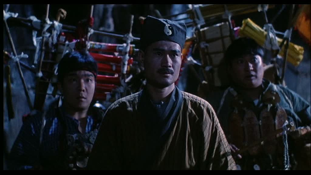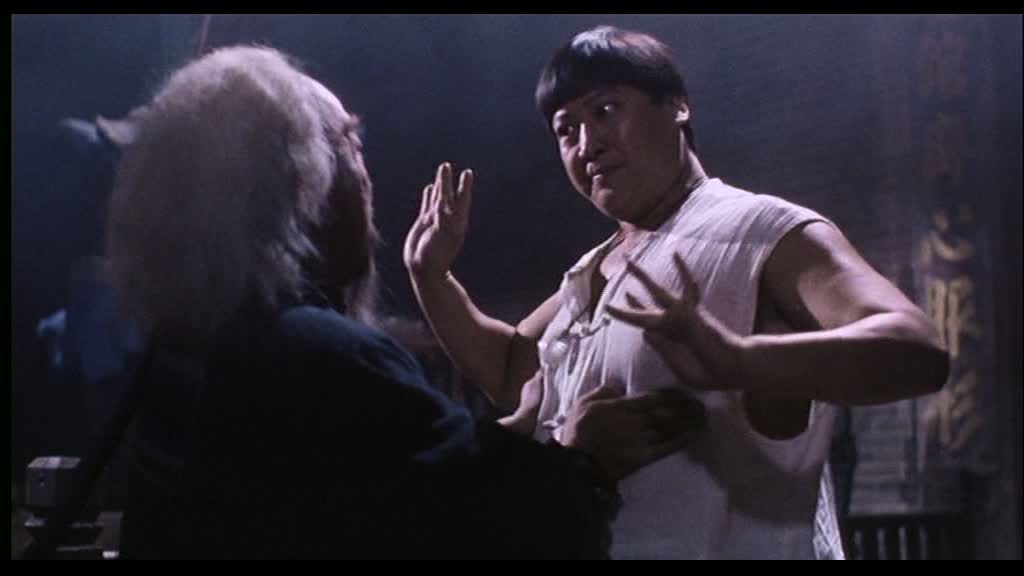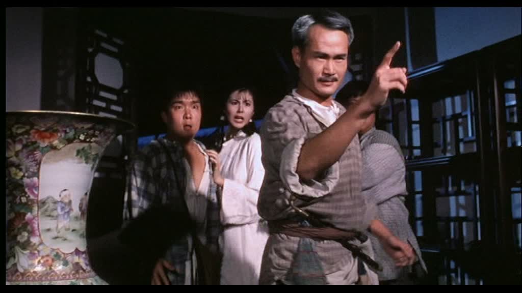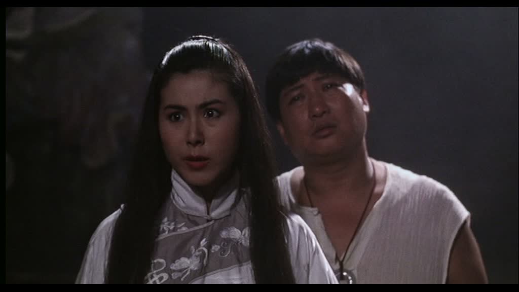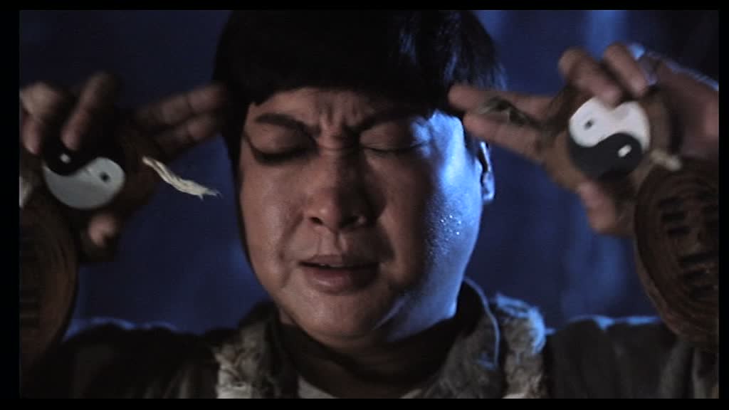 Passé ce rêve, les grandes lignes de l’histoire sont posées rapidement, et oui, aucun doute, malgré des situations différentes et des personnages en plus, le film prend bel et bien des allures de remakes. Po, joué toujours par Sammo Hung, doit se marier (il l’était déjà dans le premier opus), il a un maître dés le début de l’histoire (il arrive en cours de route dans le premier), et à cause d’un autre personnage qui va avoir recours à un maître en magie noire, Po va être la proie de tous les soucis du monde, et le film se transforme rapidement en affrontements entre maîtres. Oui, comme dans le premier opus, ou également comme dans le quatrième opus de la saga Mr Vampire. Cependant, Sammo Hung, Ricky Lau et le scénariste habituel de Sammo, Barry Wong, ne vont pas se contenter de reprendre la formule pour la décliner encore une fois, mais vont pousser le délire plus loin dans de nombreuses séquences (dés le rêve du début, ou encore dans le combat devant le restaurant au tout début, où Huang Ha fait les mêmes gestes qu’un petit singe), et ajouter une touche dramatique avec un personnage de fantôme, jouée par Wong Man-Gwan. Ce second opus possède donc un petit plus par rapport à son prédécesseur, et les femmes ont un rôle bien plus important et surtout plus valorisant (dans le premier opus, la femme de Sammo le trompait avec son maître et voulait sa mort). Hong est un personnage attachant, fantôme restant dans le monde des humains afin de s’occuper de sa mère, aveugle et presque sourde. Néanmoins, là n’est pas le cœur du récit, puisque c’est bien la guerre que vont se livrer Po et Shi pour avoir le cœur de Perle qui va amener le fantastique et la comédie dans le récit, chacun avec leur maître en magie.