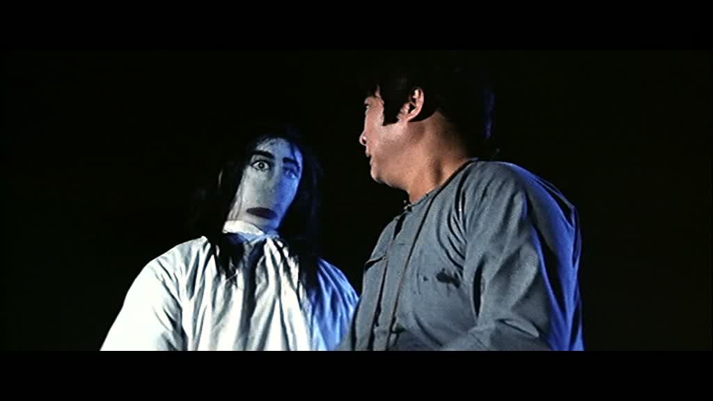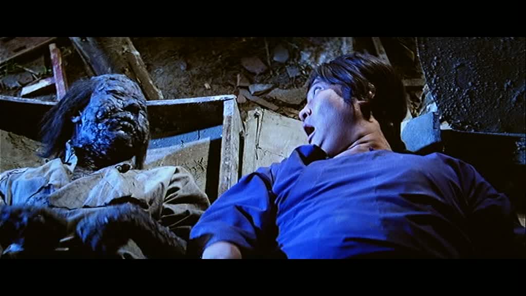 L’Exorciste Chinois va donc poser les bases, et se permette un peu tout (et n’importe quoi) à un rythme effréné. Mixant avec facilité le kung-fu, la comédie et l’horreur, Sammo Hung se permet tout donc, passant d’un genre à l’autre, installant alors dés la scène d’ouverture un rythme très soutenu. Sur une musique reprise à Suspiria (de Dario Argento, de 1977), le générique débute, pour nous montrer une scène de rêve, ou nous assistons à une discussion entre deux fantômes dans des jarres. Le comique est de mise, jusqu’à l’arrivée du pauvre Sammo Hung sur les lieux, qui va être victimes des fantômes. La comédie laisse alors immédiatement place à l’horreur, les fantômes allant tout simplement grignoter le pauvre Sammo, jouant Cheung le brave. Filmé entièrement sur fond noir, sans décors, la comédie et l’horreur sont là, avant de désamorcer l’effet en montrant alors que ce que l’on vient de voir n’est qu’un rêve.
