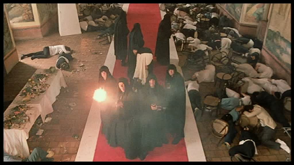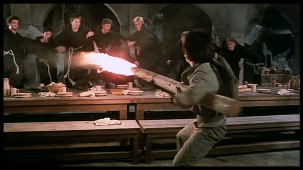 Et entre ces scènes d’action formidables, Jackie retourne bien entendu à l’humour, fonctionnant à merveille. On rigole (ou certains vont juste sourire) devant ce barman gay, ou le trio amoureux à base de quiproquo. Mais ce sera bel et bien lors de l’infiltration de l’antre des membres du culte religieux que le film nous donnera ses morceaux de bravoures lors de son final, avec deux combats cultes. Le premier opposera Jackie Chan à des moines beaucoup plus nombreux dans une immense salle de repas. Mais le vrai grand moment du métrage sera le combat opposant Jackie à 4 femmes en talon aiguilles. Jackie va se servir du décor pour pouvoir vaincre ses ennemis. Les femmes vont s’amuser, elle, à viser l’entre-jambe du pauvre Jackie, et celui ci ripostera en visant les fesses ou les seins. Un combat anthologique, mixant à merveille humour et techniques impressionnantes. Alors oui, on pourra dire que ce premier Armour of God est parfois un peu longuet et met du temps à démarrer, ce qui est le cas, le film étant loin d’être le meilleur film de Jackie Chan, mais reste totalement plaisant à suivre, et grâce à quelques moments de bravoures, reste gravé dans les mémoires pour ce qu’il est : un pur moment fun, simple, un Indiana Jones made in Hong Kong avant que Jackie Chan ne reviennent les années suivantes avec Project A 2 et Police Story 2. A noter que dans son dernier film, Chinese Zodiac, reprenant le personnage du Condor (Faucon donc) pour clore la trilogie, Jackie reprend certains éléments de ce film et de sa suite, comme par exemple le gag des chewing-gum ou tout simplement les chiens.