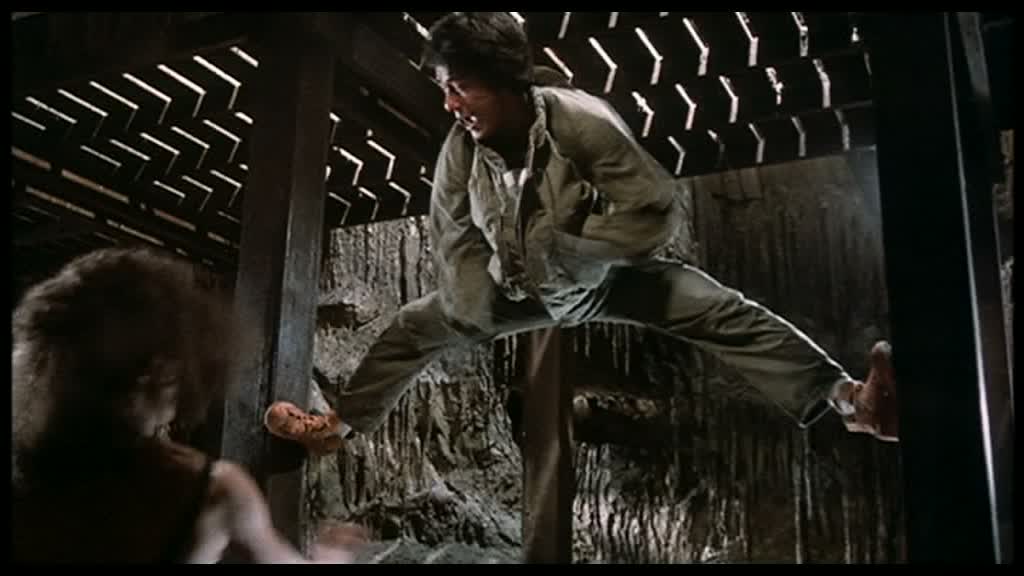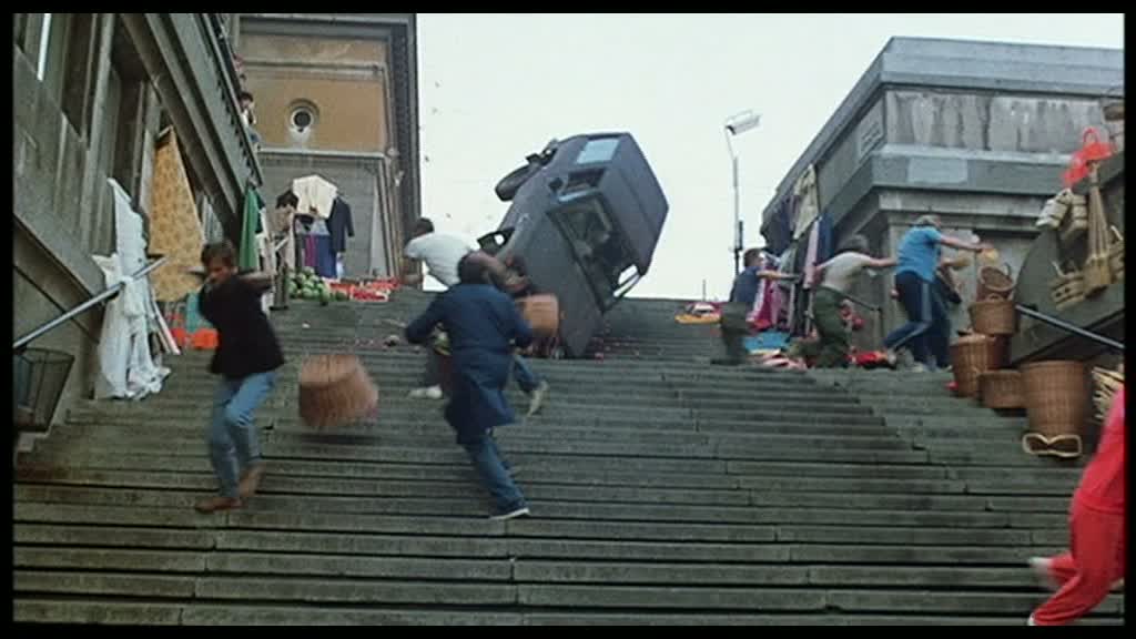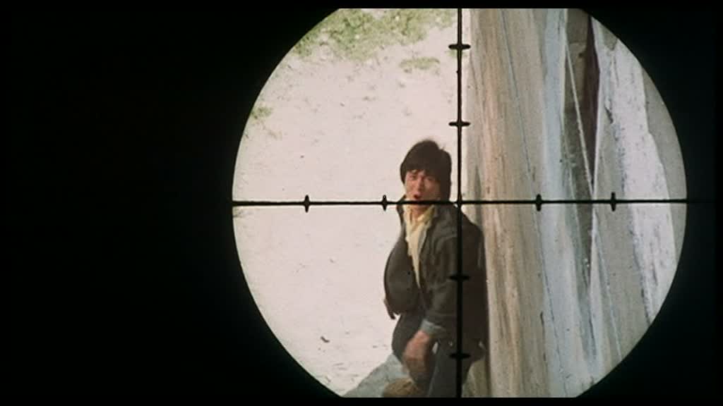 Et justement, là viendra un des défauts du métrage, puisque Jackie Chan prendra trop de temps à exposer une histoire pourtant simple. Son meilleur ami Alan demande l’aide de Jackie pour venir sauver sa petite amie, prisonnière d’un groupe religieux voulant récupérer les trois pièces manquantes de l’armure de Dieu. Une histoire simple, comme d’habitude, exposée un brin trop longtemps. En effet, pendant une petite demi-heure, on nous présente les personnages, on aura droit à une petite chanson, des ventes aux enchères, des discussions pour convaincre Jackie, sceptique au départ, avec bien entendu quelques petites blagues comme d’habitude, et même une scène assez violente où des moines armés flinguent un peu tout le monde dans une pièce, allant jusqu’à tirer une balle dans l’œil d’un photographe. Bien que fort sympathique, cette partie souffre de longueurs, et il faudra attendre que Jackie et Alan fassent équipe avec May et partent à la recherche du groupe religieux pour retrouver tous les ingrédients que l’on aime : humour (beaucoup), action (surtout sur la fin) et courses poursuites. D’ailleurs, dans le rôle de May, on retrouvera Lola Forner, aperçue dans Wheels on Meals (Soif de Justice) de Sammo Hung deux ans plus tôt, ancienne miss Espagne en 1979. Le trio va tenter de s’infiltrer dans l’antre du groupe religieux, ce qui offrira au spectateur une magnifique course poursuite en voiture, impressionnante et fun, comme ce sera le cas dans la suite. Une poursuite comme seuls les Hongkongais savaient les faire à l’époque, un pur moment de bonheur, rattrapant les longueurs de la première partie. On remarquera d’ailleurs certaines cascades en voitures similaires à celles de Wheels on Meals.