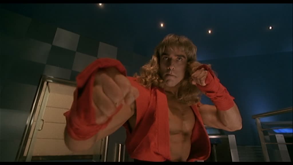 Mais comme dit plus haut, en plus d’être une adaptation (libre) et une parodie, Niki Larson est également un hommage. Et oui, dans le film, les hommages, mixés parfois allègrement avec la parodie, sont très nombreux, et surtout très divers, et ces quelques hommages nous offrent par ailleurs tout simplement les meilleures scènes du métrage. Premier morceau de choix, Jackie Chan rend hommage à la légende Bruce Lee, en diffusant un de ses films sur un écran de cinéma lors d’une scène, ce qui aidera le personnage à reproduire ses techniques afin de battre ses ennemis. L’hommage est parfait, sincère, et très amusant. Mais le gros morceau de choix du métrage sera bien entendu la parodie incroyablement débile et à mourir de rire du jeu vidéo Street Fighter. Alors qu’il affronte une nouvelle fois Gary Daniels, les personnages se transforment alors comme dans le jeu Street Fighter pour nous offrir quelques minutes d’anthologie qui plairont assurément à tout ceux ayant une culture geek ou jeux vidéos. Jackie Chan se transforme alors en Chung Li tandis que Gary Daniels prend la forme de Ken, pour un combat absolument dérisoire et fou respectant l’univers du jeux vidéo, avec ses coups, bruitages et même des angles typiquement jeux vidéos. Niki Larson va donc très loin et ne recule devant rien, quitte à énerver par moment, mais c’est ça aussi le style Wong Jing. Il nous offre, avec Jackie Chan, une comédie légère pour un large public, une comédie à l’humour crétin totalement assumé. On reconnaît la patte des deux auteurs à chaque instant, et si on adhère, c’est un pur délire, prenant, comme Twin Dragons, la forme d’une pause bon enfant pour Jackie Chan, avant de se lancer dans des projets plus sérieux (Crime Story), plus techniques (Drunken Master 2) et surtout avant de tenter une nouvelle fois une percée en Amérique.