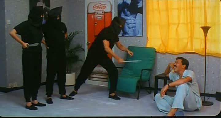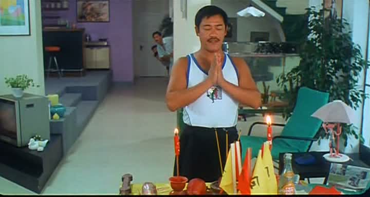 La bande, qui ne compte à présent plus que quatre membres, tente de construire un business sérieux, mais bien entendu, les problèmes ne vont pas les lâcher, et le métrage va reprendre la structure exacte de tous les précédents opus. Ainsi, dans un premier film, le film prend la forme d’une comédie tout à fait banale avec l’irruption au sein du groupe d’une femme, qui va travailler pour eux. En éternels pervers, on se doute bien que les ennuis et surtout les idées afin de se rapprocher de la demoiselle vont affluer. Bingo. Après la culte scène du marché de Winners and Sinners, après la scène des ninjas voleurs de My Lucky Stars, après la scène de l’incendie de Twinkle Twinkle Lucky Stars, après le… non rien ne me vient à l’esprit pour Lucky Stars Go Places, ici, la bande ne va rien trouver de mieux que de se faire passer pour les fantômes de défunts ayant vécus dans l’appartement. Autant revoir Stanley Fung et Richard Ng fait plaisir, autant cette fois ci, la sauce ne prend pas face à ce manque d’originalité. Richard Ng justement, après sa tentative d’invisibilité, les livres d’auto persuasion ou les poupées vaudou, il tentera cette fois ci des cultes afin d’avoir un corps aussi dur que l’acier. Encore une fois, la sauce ne prend pas véritablement, même si ces mimiques ou certaines situations vont nous faire sourire bêtement, comme dans la scène de l’escalier lors du final, un avant goût de True Lies, quelques années avant. Le scénario, pourtant signé Wong Jing et Stanley Fung, ne reprend que les gags et situations des précédents opus sans ajouter une quelconque nouveauté, et s’avère bien feignant. Quand la police viendra faire appel aux Lucky Stars, c’est encore le même stratagème que dans le second opus qu’ils vont utiliser, pour les forcer à accepter.