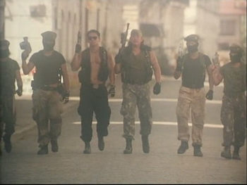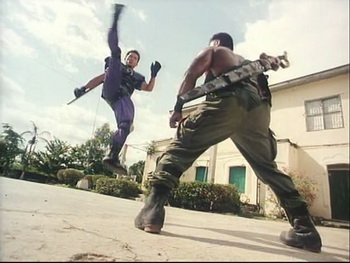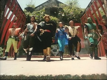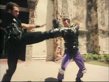 Puisqu’on se trouve dans une sorte de jeu video live, ce dernier a du se dire que piller bon nombre d’idées dans les jeux de baston typiques des années 90, voire même carrément dans des mangas cultes de cette époque, ça serait bien plus stylé… On a donc droit à un personnage carrément pompé sur celui de Bison dans Street Fighter 2 avec son costume rouge, des ninjas jaunes ou verts faisant directement référence dans leur look aux personnages de Scorpion et Reptile dans Mortal Kombat, certains qui pompent directement leurs mouvements, effets visuels à l’appui, chez SNK avec des jeux tels que Fatal Fury ou King of Fighters. Et c’est sans parler de certains passages tout droit sortis des Chevaliers du Zodiaque lorsque le grand maitre de Shinryu médite près d’une cascade alors que ce dernier s’y entraine… le tout avec des effets spéciaux dignes d’un Mr Vampire voire même d’un Zu qui lui est sorti plus de 15 ans plus tôt…