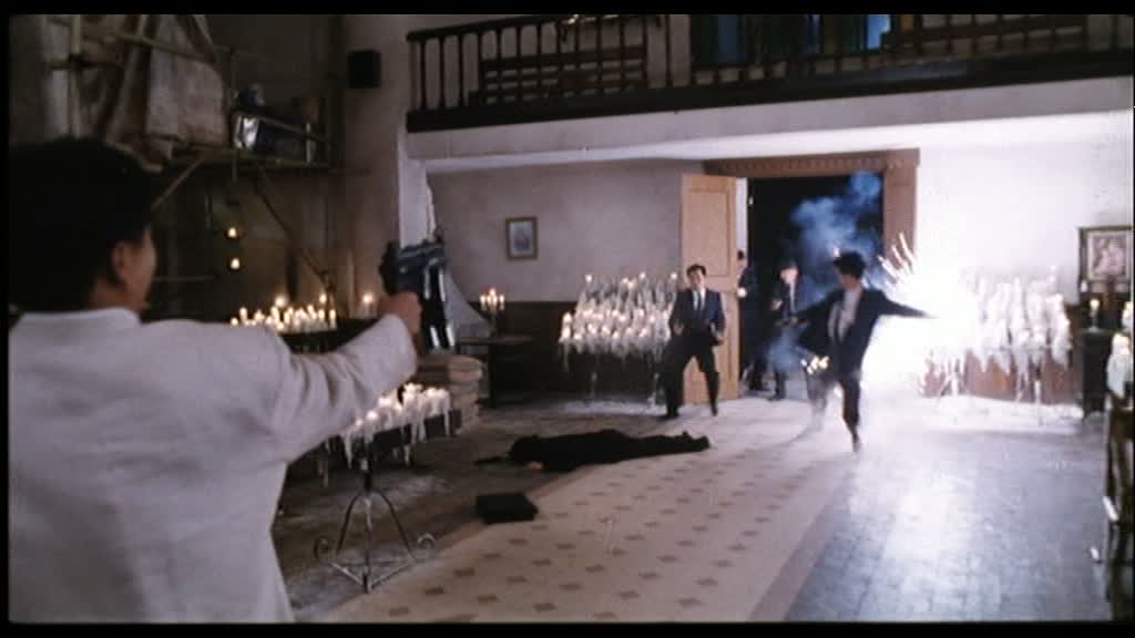 Soyons honnête, The Killer regorge de défauts. Comme ne pas être tenté de rire devant les costards à rayures de Danny Lee ressemblant à des pyjamas, devant ces phrases mielleuses sur l’amitié où l’on « réglera nos comptes dans l’au-delà », devant cette histoire vue et revue, devant ces moments d’émotions faciles ? Mais pourtant, la magie opère, dés la première scène dans l’église ou nous faisons la rencontre de Jeff, payé pour éliminer un homme. Les défauts, ils sont voyants, et pourtant, on s’en moque éperdument, plongeant dés les premiers instants dans un univers qui n’est pas le notre, celui de John Woo. Cet univers où tous les personnages ont la classe, qu’on le veuille ou non. Mais surtout, cet univers où, armé d’un revolver six coups, nous pouvons tuer deux adversaires en tirant une vingtaine de balles sans avoir à recharger une seule fois. La force de John Woo est de nous faire rentrer dans son univers, de le rendre attachant, prenant, jouissif, malgré ses facilités, ses incohérences, et surtout son côté poseur et totalement surréaliste, où pour avancer, chaque ennemi devra faire une roulade inutile au sol avant de se faire cribler de balles, au ralenti, et de mourir.