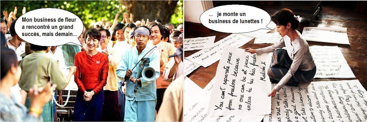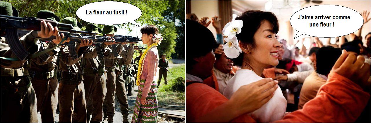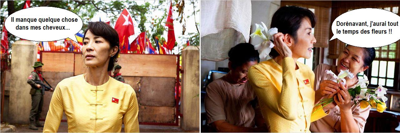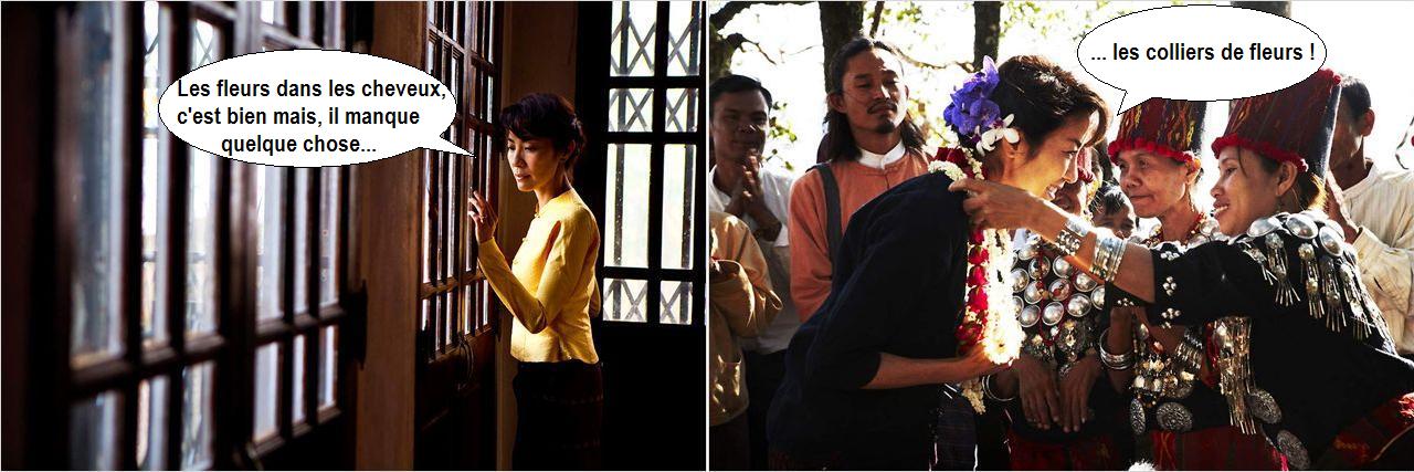 Le choix de faire du mélo, en lieu et place d’une biopic propre, s’avère à mon sens payant. Ce choix offre de véritables scènes de cinéma, belles et touchantes. Il permet finalement de se rendre compte à quel point le choix fait par Aung San Suu Kyi et sa famille a pu être difficile, déchirant et douloureux pour eux. Le montage alterné, entre Aung San Suu Kyi enfermé dans sa maison en Birmanie et son mari essayant depuis Londres de la soutenir comme il le peut, est efficace, comme cette belle scène de remise du prix nobel de la paix. On est vraiment proche de la question humaine et de l’enchaînement des personnages à leur histoire. Un film lorgnant sur le documentaire n’aurait pas permis de reconstituer cette palette des sentiments. La narration de cette histoire d’amour n’empêche pas le film de saupoudrer çà et là quelques éléments historiques sur l’évolution de la situation.