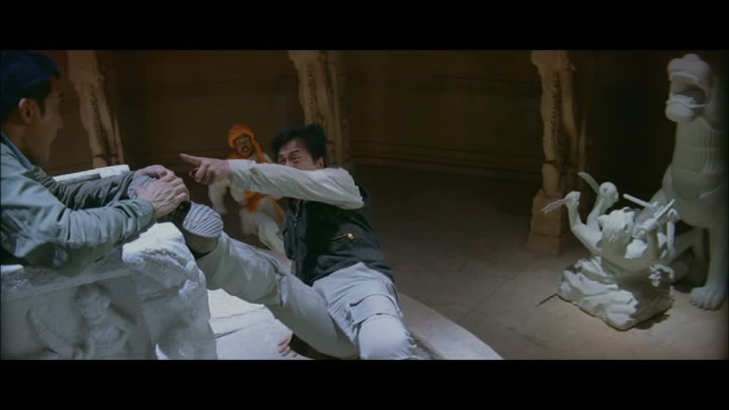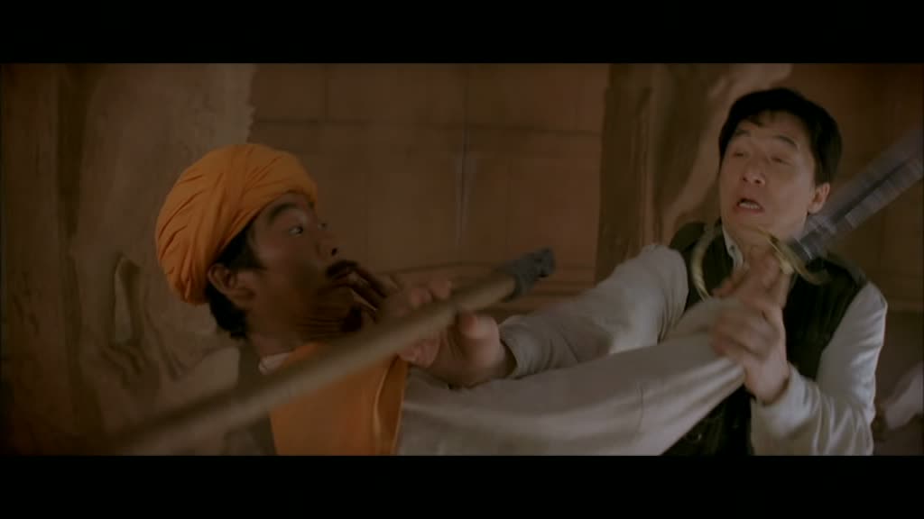 L’intrigue principale justement, parlons en. Se déroulant de nos jours, on y trouve encore Jackie Chan, cette fois ci dans le rôle d’un archéologue un brin aventurier et n’hésitant pas à effectuer des cascades pour satisfaire ses fans. On se retrouve donc devant un produit basique et sans vraiment d’imagination, à quelques exceptions près, un sous Indiana Jones, ou disons même, un sous Opération Condor. Tong comme Chan, choisissent la facilité et ne prennent aucuns risques dans cette partie, nous livrant un produit calibré et prévisible. Quelques petites scènes sympathiques viendront bien entendu se glisser dans la tableau, notamment un combat se déroulant sur un tapis roulant… et collant. L’idée est excellente, mais l’humour parfois lourd vient s’inviter dans la partie, faisant retomber beaucoup d’effets. Ce combat justement, où les acteurs doivent retirer leurs vêtements petit à petit, ne peut s’empêcher de se terminer sur une petite note d’humour avec un boxer orné d’un smiley (rappelant le boxer koala de Contre-Attaque). L’humour s’incruste donc de manière pas forcément subtile, et ne sera pas aidé par l’un des grands défauts du métrage : ses effets spéciaux. Dès qu’un saut est trop dangereux, Jackie Chan sera alors filmé de loin et le numérique entrera en jeu. Ça n’aurait pas été un souci, si l’animation ne manquait pas autant de naturel. On pourra aussi noter le fait qu’un serpent sera digitalisé aux côtés de Jackie, et le résultat n’est pas glorieux. Pire, dès que Jackie Chan ne sera pas à l’écran dans cette partie, le scénario s’axera sur son ami scientifique William (Tony Leung Ka Fai) pour nous offrir les moins bons moments du métrages, avec des méchants (très méchants) et du numérique (vilain), le tout pour une intrigue des plus simplistes. On pourra retenir néanmoins la participation de la magnifique Mallika Sherawat (Hiss) au métrage.