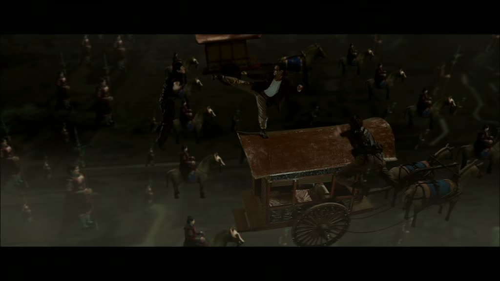 Ainsi, alors que la partie se déroulant dans le passé s’en sort le mieux, malgré quelques défauts, et que la partie présente plus axée sur l’aventure déçoit amplement malgré quelques passages amusants ou bien trouvés, Stanley Tong réunit les deux époques pour son final, et va donc tenter de nous en mettre plein la vue. Sur le papier certes, l’idée est d’ailleurs excellente. Réunir les personnages des deux époques dans un tombeau gigantesque où une armée se tient là, en apesanteur. A l’image, le résultat est tout autre. Si les clichés arrivent en pagaille, la réalisation de Stanley elle se veut accrocheuse. En termes d’angles de caméra, de mouvements, c’est classe. Malheureusement, ce moment voulant tout mixer se révèle rapidement imbuvable pour de multiples raisons, la principale étant des effets numériques datés d’une autre époque, ou tout simplement non finalisés. Le résultat fait peur et abîme la rétine oui, et c’est bien dommage. Certes le métrage est pleins de bonnes intentions, parvient à nous livrer quelques scènes de batailles bien trouvées, mais en se voulant trop ambitieux tout en essayant de satisfaire le public avec un produit extrêmement commercial, Stanley Tong tout comme Jackie Chan se plantent. En permanence, d’une scène à l’autre, le bon côtois le mauvais, et si le résultat aurait pu être bien pire (mais aussi bien mieux), The Myth ne laisse pas un grand souvenir, même s’il comporte une scène valant assurément le détour.