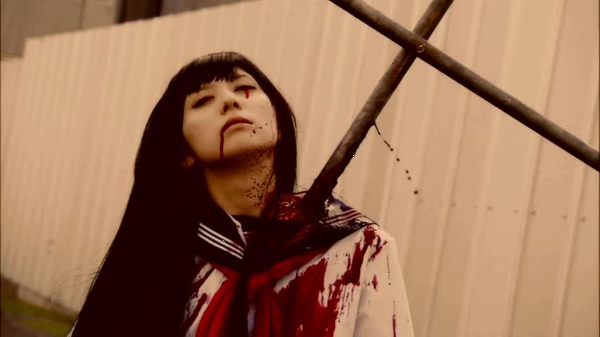 Tomie, à la base, c’était un manga, signé par Ito Junji. Sortis en France en 3 gros volumes (attention, je fais de la pub, chaque volume étant vendu à 9 euros neuf), les œuvres ne s’avèrent pas être le meilleur travail de Ito, mais pas loin (et oui, il y a aussi Spirale, alias Uzumaki). Il n’aura pas fallu attendre bien longtemps pour que le manga soit adapté au cinéma, dès 1999 par Oikawa Ataru, réalisateur très inégal qui n’aura pas signé d’œuvres originales dans sa carrière. Et jusqu’à l’année dernière, la saga contenait pas moins de 8 opus. Une saga totalement déséquilibrée, entre un premier opus un peu mou, un second passable, deux opus excellents, un cinquième sympathique (encore signé par Oikawa), un sixième exécrable (tiens, encore de Oikawa) et un Tomie VS Tomie que je n’ai pas encore eu le courage de regarder, sans compter un épisode de V-Cinéma. Et à présent, c’est à Iguchi Noboru, bien connu de l’amateur de bizarreries pour avoir signé le sympathique The Machine Girl et le raté RoboGeisha, qui s’attaque à un nouvel opus : Tomie Unlimited. Le projet faisait peur, mais intriguait. La saga Tomie tourne en rond depuis longtemps après tout, et on voit mal comment y ajouter un peu de sang neuf. De plus, voir Iguchi à la mise en scène n’est pas pour rassurer, tant le bonhomme a pour habitude d’étendre de superbes concepts en film bien trop longs pour ce qu’il a à nous raconter. Ajoutons à cela que l’on retrouve au scénario Tsugita Jun, qui a signé le scénario de Mutant Girls Squad (très fun certes, mais au scénario…. Plus que limité on dira) et réalisé récemment Fashion Hell, sympathique également, mais pas de quoi se relever la nuit. Tomie Unlimited commence avec de mauvaises bases, et pourtant… Oui, au final, il s’avère être une agréable surprise. Certes, rien de forcément exceptionnel non plus, le film ayant ses défauts, mais dans une saga comme celle ci, le métrage se hisse facilement parmi les meilleurs. A croire que quand il le veut, Iguchi peut maîtriser réellement son film du début à la fin (bon malgré des fausses notes sur la fin notamment). Dès la scène d’ouverture, nous sommes dans le bain, avec une fausse tranquillité posée, une peu niaise avec la musique accompagnant la scène, son filtre orangé sur l’image, et quelques secondes plus tard, une Tomie (que l’on reconnaît comme d’habitude à son grain de beauté sous l’œil gauche, et au fait qu’elle attire tous les hommes) se fait transpercer par une gigantesque barre en métal en forme de croix.