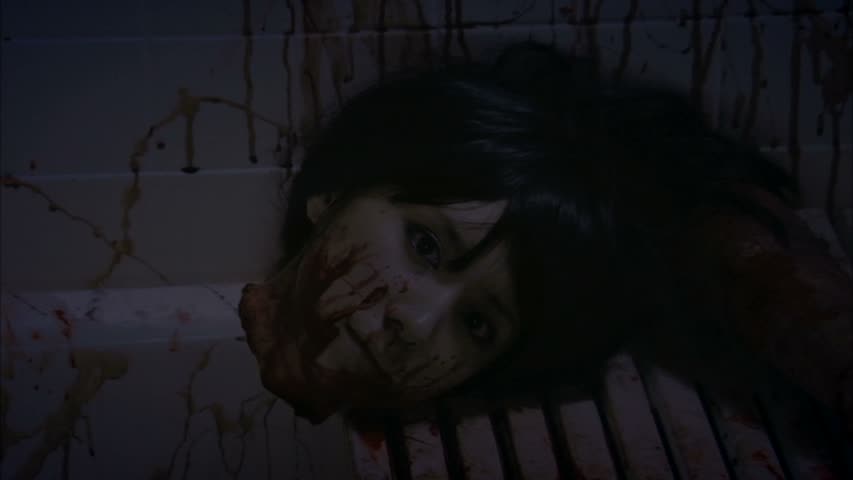 Puis intervient la seconde partie du métrage, qui opère en quelque sorte un gros virage, en plongeant dans une ambiance beaucoup plus grotesque, et beaucoup plus sanglante. On aurait pu craindre l’inverse, comme souvent, et que Iguchi tombe en panne totale d’inspiration en étirant son film, mais il parvient avec l’aide de son scénariste à se renouveler de manière intéressant, en multipliant les apparitions de Tomie sous différentes formes. Si visuellement, c’est parfois limité (d’affreux effets numériques, même si on a vu pire ailleurs), les idées sont là. Entre la Tomie sans tête qui va courser notre héroïne partout, une tête de Tomie se baladant à l’aide de ses cheveux, une autre se constituant à partir d’une marre de sang et j’en passe, le film ne finit par de surprendre. Il surprend dans la forme et dans les idées, car scénaristiquement, la trame reste à peut près identique aux films précédents, le personnage est bien établit, et pas grand chose ne change. Et ce jusqu’au final, alternant de purs bons moments, et d’autres beaucoup moins accrocheurs. Il faut dire que j’ai de plus en plus de mal avec les giclées de sang numérique, et le film en contient pas mal. Ce qui n’empêche pas de savourer le métrage pour ce qu’il est : un métrage rythmé, soutenu, généreux, classique certes, mais bourré d’idées visuelles. Le genre de métrage que l’on n’attendait absolument pas, et donc assurément une bonne surprise, avec son lot de défauts et de qualités. Si Iguchi continue sur cette voie, on ne peut qu’attendre ses prochains métrages.
