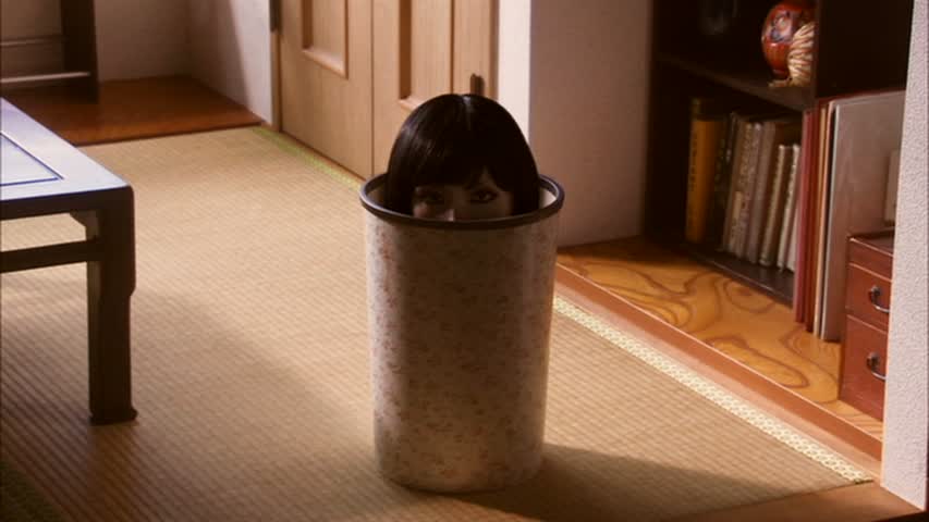 Pas de doute, même sans le savoir, on reconnaît le travail de Nishimura Yoshihiro aux effets spéciaux, et on comprend rapidement qu’avec une telle équipe à la barre, Tomie Unlimited ne ressemblera à aucun autre film de la saga. Du moins, visuellement et dans ses partis pris, car au niveau de l’histoire, c’est une autre histoire justement… Enfin, passé cette sublime scène d’introduction, le film se découpe en deux parties distinctes. La première va tout axer sur l’étrangeté de la situation, le comportement décalé de ces personnages, en tentant de faire monter la tension. Iguchi soigne sa mise en scène et son montage, si bien que l’ensemble fonctionne plutôt bien, malgré une impression de déjà vu par moment. Aucune surprise donc à voir notre fameuse Tomie revenir à la vie, attirer les hommes, et même sa famille malgré son comportement de chieuse, ou finir décapitée (comme dans beaucoup d’épisodes). Pour l’occasion, Tomie change encore de tête, comme à chaque opus, et c’est Miu Nakamura qui interprète la beauté fatale cette fois ci. L’amateur de V-Cinéma l’au déjà aperçu ces dernières années dans les deux Uniform Survigirl (premier opus fort sympathique, le second beaucoup moins) ou dans Teketeke 2 de Kôji Shiraishi (Grotesque, Noroi, Kuchisake-Onna). Elle joue une Tomie tout à fait convaincante, loin des derniers essais à ce jour à côté de la plaque, tour à tour séductrice ou vraie garce que l’on a envie de baffer. Les situations s’enchaînent très rapidement, et l’ambiance, prenante, se pose doucement. L’emprise de Tomie sur sa famille sera à la fois amusante et étrangement dérangeante, entre le père qui va lécher avec amour ses cheveux, la mère qui brûlera toutes ses photos et carrément une scène ambiguë dans la salle de bain… Dommage que ça ne va pas plus loin. Le drame continue à l’école, et Iguchi se lâche quelques peu en scènes plus horrifiques (le coup de la boite à Bento par exemple), et ça fonctionne toujours. Classique, mais efficace. Réalisation carrée, musique d’ambiance, bons maquillages. On ne demandait rien de plus.