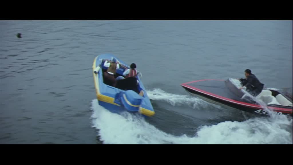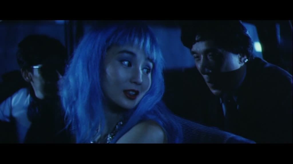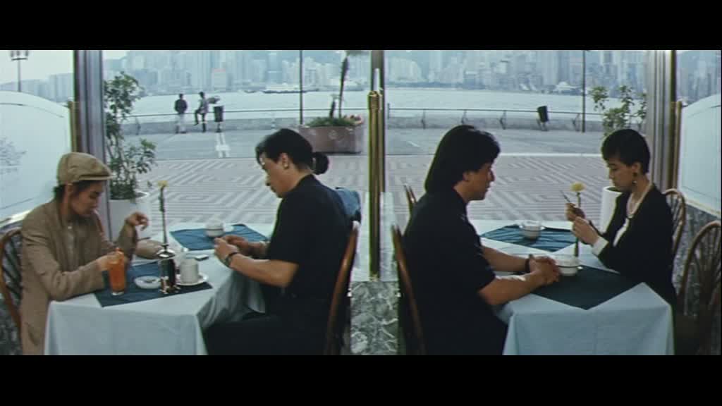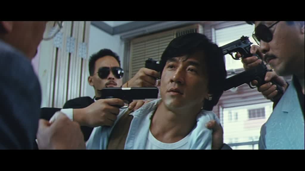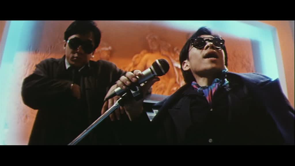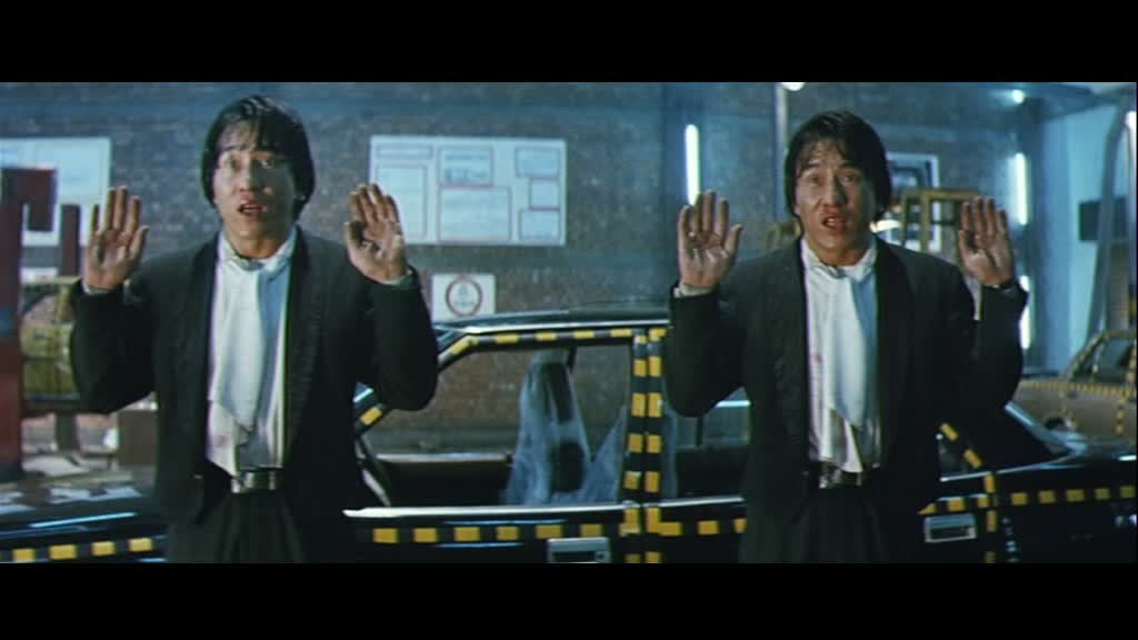 Un début sec, assez froid, effet renforcé par le filtre présent sur l’image. On les retrouve de nombreuses années plus tard, et là, dés que Jackie arrive à l’écran, deux fois donc, le film prend immédiatement le ton de la comédie. Jackie interprète donc d’un côté un musicien poli et courtois, et de l’autre un jeune homme qui a grandi dans la rue. Et dès l’arrivée de Ma, le musicien, à Hong Kong, les choses tournent au gros délires, puisque par un simple accident, chacun va fréquenter la « femme » de l’autre. Ainsi, le gentil Jackie propre sur lui va se retrouver avec Maggie Cheung, qui n’aimait justement pas les manières du Jackie Chan qu’elle connaît, et celui ci va justement se retrouver avec Nina Li Chi, qui s’ennuyait du Jackie qu’elle connaît. Les filles y trouvent un avantage, et cela va amener des situations extrêmement folles, puisque l’un va se retrouver face à des gangs alors qu’il devrait conduire un orchestre, et vice versa.