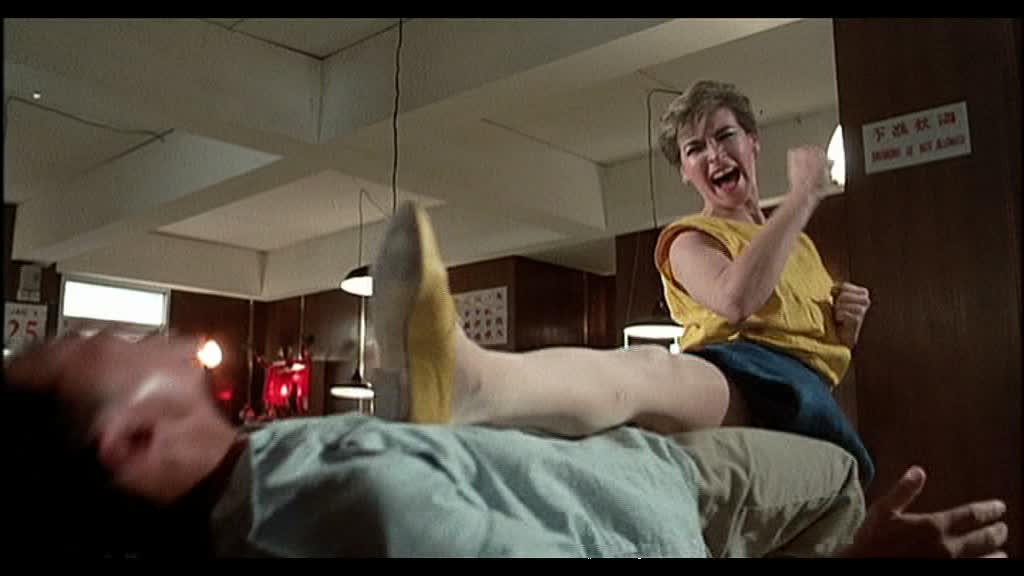 En terme de qualité à proprement parler, Righting Wrongs, rebaptisé en France Une Flic de Choc (raaaah), est sans aucun doute le meilleur métrage de Corey Yuen. Jusqu’alors réalisateur de seulement deux films, Yuen sortait de Yes Madam ! (Le Sens du Devoir 2), comédie pas franchement drôle qui se rattrapait dans ses dix dernières minutes d’action non stop ! Le voir enchaîner sur Righting Wrongs est surprenant, puisqu’à quelques exceptions près, les métrages n’ont absolument rien en commun, et il suffit de voir la scène d’ouverture pour s’en rendre compte. L’humour est totalement relégué au second plan cette fois-ci, malgré quelques notes par-ci par-là, notamment par la présence au casting de… Corey Yuen himself, dans le rôle d’un flic pas très doué.