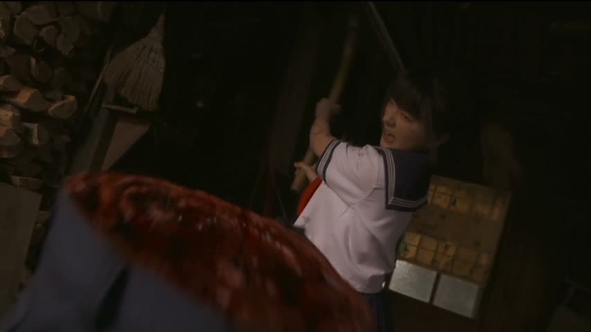 Pendant une vingtaine de minutes, le métrage nous présente donc une bande de jeune tout ce qu’il y a de plus banale : la fille aux (très) gros seins, la fille en costume d’écolière qui fait du karaté, le cinglé (qui jouait d’ailleurs dans Helldriver de Nishimura), le gars avec une coupe de cheveux horrible. Bref, du bon monde. Et c’est parti pour un petit festival de vannes de merde et de pets, avec en bonus quelques plans fessiers. Iguchi se lâche totalement, et oui, il faut l’avouer, ça fonctionne bien, on rigole devant ses gags franchement débiles et bons enfants, et une petite diarrhée plus tard, nos vrais zombies sortant de la fausse sceptique débarquent, par dizaines, pour s’en prendre à nos personnages. L’humour bas de plafond, le gore, tout nous arrive d’un coup en pleine figure, à l’image de ces zombies qui balancent de la merde à nos personnages. Le film se transforme alors en huit clos plutôt bien rythmé, nos personnages trouvant refuge dans une maison isolée, où sévissent bien entendu un scientifique, accompagné de sa fille. Iguchi se fait plaisir, nous fait plaisir, d’autant plus que les effets spéciaux sont de bonnes factures, et que l’humour fonctionne et ne tombe pas à l’eau, comme dans RoboGeisha. Ça ne semble jamais forcé, tout sort naturellement, ce qui est le comble pour un film de zombies scato. Iguchi alterne comme au bon vieux temps d’un Machine Girl les effets comiques et les effets gores crades, auxquels il ajoute donc cette fois ci quelques plans scatos. Autant le dire, jamais autant de choses ne seront sortis et rentrées des fesses de ses personnages (bon, il y avait bien une tronçonneuse dans Mutant Girls Squad et des katana dans RoboGeisha). Quelques effets numériques moins convaincants viennent bien entendu s’ajouter au lot, mais bon, utilisés plutôt modérément, ça passe… la plupart du temps.