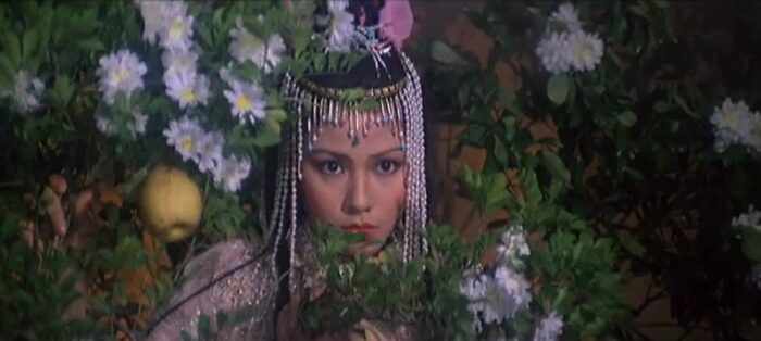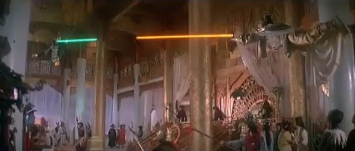 Tout n’est heureusement pas raté dans Descendant of the Sun. Le réalisateur de Black Rose a encore un authentique sens visuel pour lui. Profitant des moyens mis à sa disposition, des studios de la Shaw en passant par ces fameux effets spéciaux grattés à même la pellicule, Chor Yuen nous emmène dans un univers ultra coloré, fait de lasers rouge, de costumes brillants et de maquettes trop ambitieuses. L’ensemble tire régulièrement sur le Kitsch mais fonde un univers cohérent et très agréable visuellement.