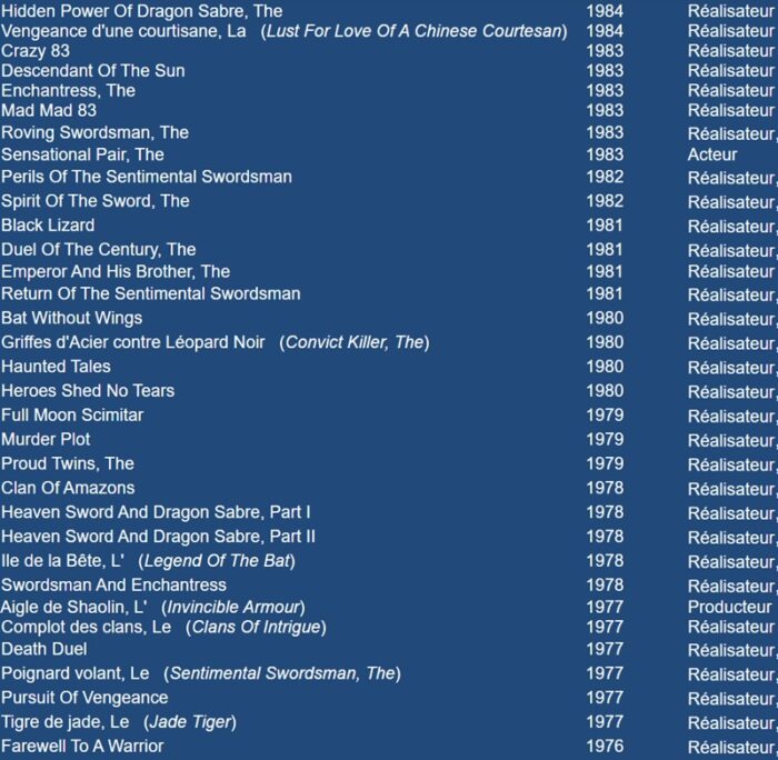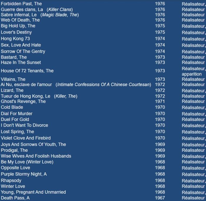 Né en 1934 dans la province de Canton de Cheung Wood Yau, un acteur cantonais des années 40-50, il étudie d’abord la chimie, mais se passionne vite pour le cinéma et devient scénariste puis assistant réalisateur. En 1956, il écrit le script du film The Soul Stealer pour le réalisateur Ng Wui. L’année suivante il passe à la mise en scène en co-réalisant Bloodshed In The Valley Of Love avec le vétéran Chin Chien. A cette époque, la star number one est sans conteste Patrick Tse Yin, une sorte de Rudolph Valentino chinois qui fait craquer les dames (il fera un come back retentissant en 2001 en devenant le diabolique manager de foot de la Evil Team dans Shaolin Soccer et il est en outre le père de la star des teenagers Nicholas Tse). En 1959, Chor Yuen réalise son premier film seul, il s’agit d’un mélo à l’eau de rose avec le même acteur précité, son titre Grass By The Lake. Par la suite Chor Yuen réalisera une soixantaine de films de ce genre avec la star du moment, dont les titres sont souvent très démonstratifs : True Love, My Only Love, Forever Beloved… Très attiré par les intrigues policières il réalisera en 1965 Black Rose avec le même Patrick Tse Yin et l’actrice Connie Chan. Après avoir fait se succéder romance et films policiers pendant plus de dix ans, il réalise en 1970 le wu xia pian Cold Blade. En 1972, il met en scène le très moyen Killer (tiens ! ! !) avec Chin Han et Wang Ping qui a la particularité d’avoir été édité en vidéo en France sous le titre de L’œil Du Dragon. La même année il réalise une très «chaude» romance avec Lily Ho dont le titre est très démonstratif, Intimate Confessions Of A Chinese Courtisan, ce film montrera les premiers fragments du saphisme si présent dans les films d’épées féminins. La célèbre maison de production Cathay commence sérieusement à battre de l’aile et une célèbre concurrente fait parler d’elle, il s’agit de la maison de productions des frères Shaw, dont le nom est très justement amené, la Shaw Brothers. Chor Yuen ne tarde pas à rentrer dans les rangs de la célèbre firme et il rejoint le Movieland. Chor Yuen réalisera une comédie avec Yueh Hua qui aura la particularité de battre Bruce Lee au box-office, son titre House Of 72 Tenants, le remake d’un vieux mélodrame mandarin. Mais c’est dans le wu xia pian que Chor Yuen réussira ses plus beaux fleurons. En 1976, il réalise Killer Clans qui a la particularité de rassembler des futures stars comme Danny Lee et Norman Chu (à noter que ce film fera partie de la première fournée des dvds tant attendus de la Celestial Picture). La même année il réalise son film le plus célèbre, le très attendu (en dvd) Magic Blade, qui impose Ti Lung dans le rôle d’un épéiste solitaire, rôle que l’acteur reprendra à plusieurs reprises, notamment dans la série des Sentimental Swordsman. Contrairement à un Chang Cheh par exemple qui a toujours imposé un style réaliste à ses films, Chor Yuen apporte une ambiance à la limite du fantastique, de plus les intrigues à tiroirs et le sens irrationnel de son œuvre en font peut-être le pilier d’un genre qui par la suite fera bien des émules dans l’ex-colonie. Citons ainsi un réalisateur comme Tony Ching Siu Tung par exemple qui s’inspirera fortement de ce style notamment le côté saphique d’une œuvre comme Intimate Confessions… que l’on retrouvera dans la filmographie de ce dernier avec des films comme A Chinese Ghost Story (Histoires de fantômes chinois) et East Is Red /Swordsman 3.