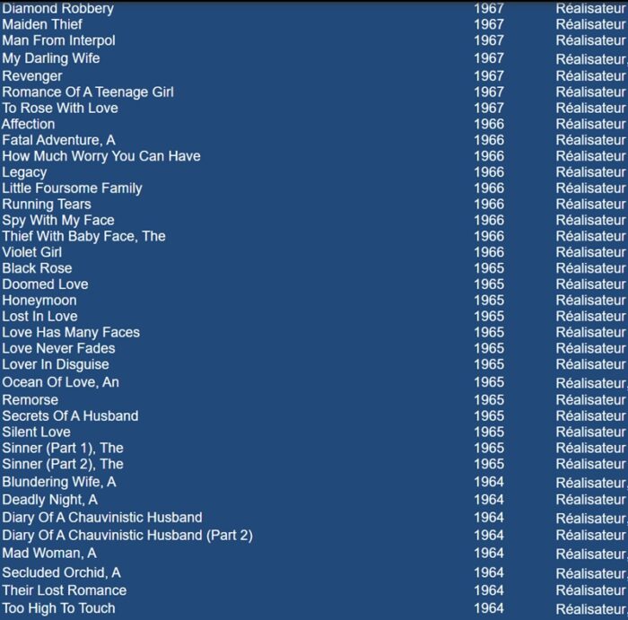 Mais ce qui restera la grande force de ce réalisateur trop souvent ignoré, c’est cette faculté d’avoir apporté une vision fantastique au film de sabre, une touche résolument esthétisante et un sens pointilleux de l’intrigue qui donnera à disserter aux cinéastes hongkongais dans le registre du film d’heroic-fantasy. Une manière comme une autre de contredire le penchant ultra-réaliste des oeuvres de Chang Cheh.