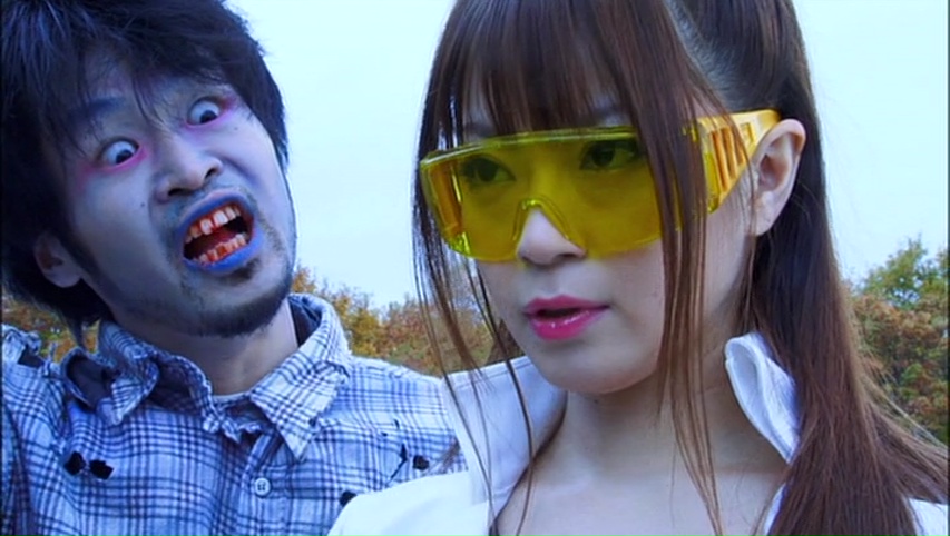 Il y a des méchants très méchants et ridicules, des héroïnes en tenues criardes très courtes, une tortue en plastique qui parle et qui n’est même pas animée, des zombies, des seins, des plans culottes, des combats qui feraient rougir même un tâcheron comme Uwe Boll tellement c’est honteux, des bruitages de cartoon, aucune mise en scène, aucune photographie, et ne parlons pas du montage. Le vide, absolu. Est-ce que le film était un défi ? A-t-on forcé l’équipe, pistolet contre la tempe, de faire ça ? Où est-ce une vaste blague pour voir combien cela peut rapporter à l’équipe après un apport minimal ? Non car niveau décors, costumes, tout, c’est le vide absolu. Une école vide, des bâtiments désaffectés, une usine et un champ, et voilà le décor du Japon de 2099. À côté même le cinéma d’Iguchi paraît couteux. Les maquillages, n’en parlons pas. Entre les zombies sur lesquels on aurait juste mis de la poudre et du rouge à lèvre bleu, des pseudos ninja portant des costumes de cambrioleurs du pauvre, ou un grand méchant avec de la peinture sur la gueule et son costume doré moulant, on est servis niveau ridicule. Mais du ridicule pas drôle. Pas une seule seconde. Et lorsque le film veut faire de l’humour, on comprend rapidement que rien n’est sérieux, et c’est encore plus ridicule. Notre grand méchant assit dans l’ombre et caressant un chat en peluche pour faire hommage à James Bond, les bruitages cartoons lors des combats. Pourtant de base, on a presque l’impression de voir ici un hommage aux Sentai. Après tout, le mot est dans le titre.