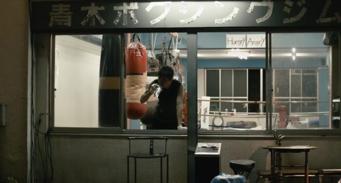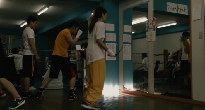 Oui, je grille quelques étapes en vous racontant tout ça. Car le tout est parsemé de petits rebondissements, parfois amusants (cette vieille dame passant tous les soirs récupérer les produits périmés même si le patron du magasin est contre), parfois beaucoup moins amusants avec ce collègue lourd qui veut absolument se faire Ichiko. Et puis, il y a la rencontre avec Yuji, qui passe tous les jours acheter des bananes, et qu’Ichiko va épier à la salle non loin de là, où il s’entraîne. Car Yuji est boxeur. Et petit à petit, Ichiko va se retrouver dans le milieu, pour avancer dans sa propre vie, pour se défouler, faire sortir sa propre rage, mais finalement, aussi pour se dire, après un possible match, que tout va bien, lorsque les boxeurs venant de s’affronter finalement se serrent dans leurs bras. Oui, plus qu’un drame, plus qu’une comédie, c’est finalement le récit de l’émancipation du personnage qui compte qui mélange les genres avec une certaine justesse. Tour à tour, on aura de la comédie, parfois ironique, parfois extrêmement noire, puis du film dramatique, voir même social, avant de plonger dans le film sportif. Le film évolue, constamment, dans le seul but de faire évoluer son personnage principal, qui passe d’hikikomori (ces gens qui ne sortent pas de chez eux et n’ont aucune ambition, aucune envie de faire quelque chose de leur vie) à employée à boxeuse. Et cette évolution, on la trouve pour tous les personnages. Ichiko va craquer pour Yuji, boxeur dépressif, les deux vont se rapprocher, et avec ce simple contact, ce simple besoin d’amour, ou de reconnaissance, ou les deux en fait, ils vont tous deux évoluer, et Yuji va également dans un sens prendre sa vie en main, en cherchant de nouveaux emplois, et finalement, sa voie va l’éloigner d’Ichiko. Cette évolution, on la remarque aussi dans les personnages secondaires, de manière bien moins positive d’ailleurs, avec ce collègue de travail qui au départ, semble être juste le mec relou qui nous suit partout et espère être drôle dés qu’il ouvre la bouche.