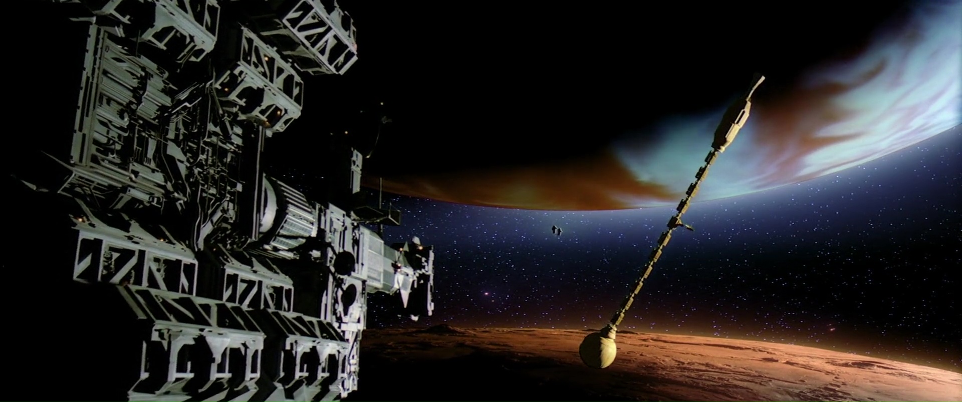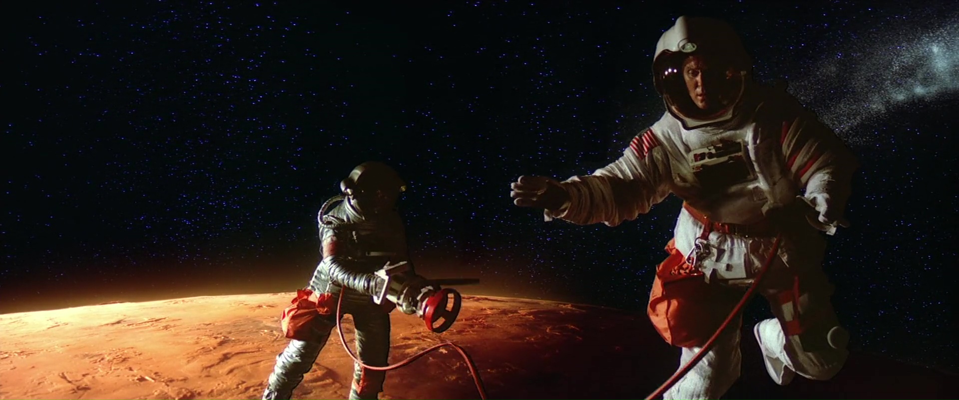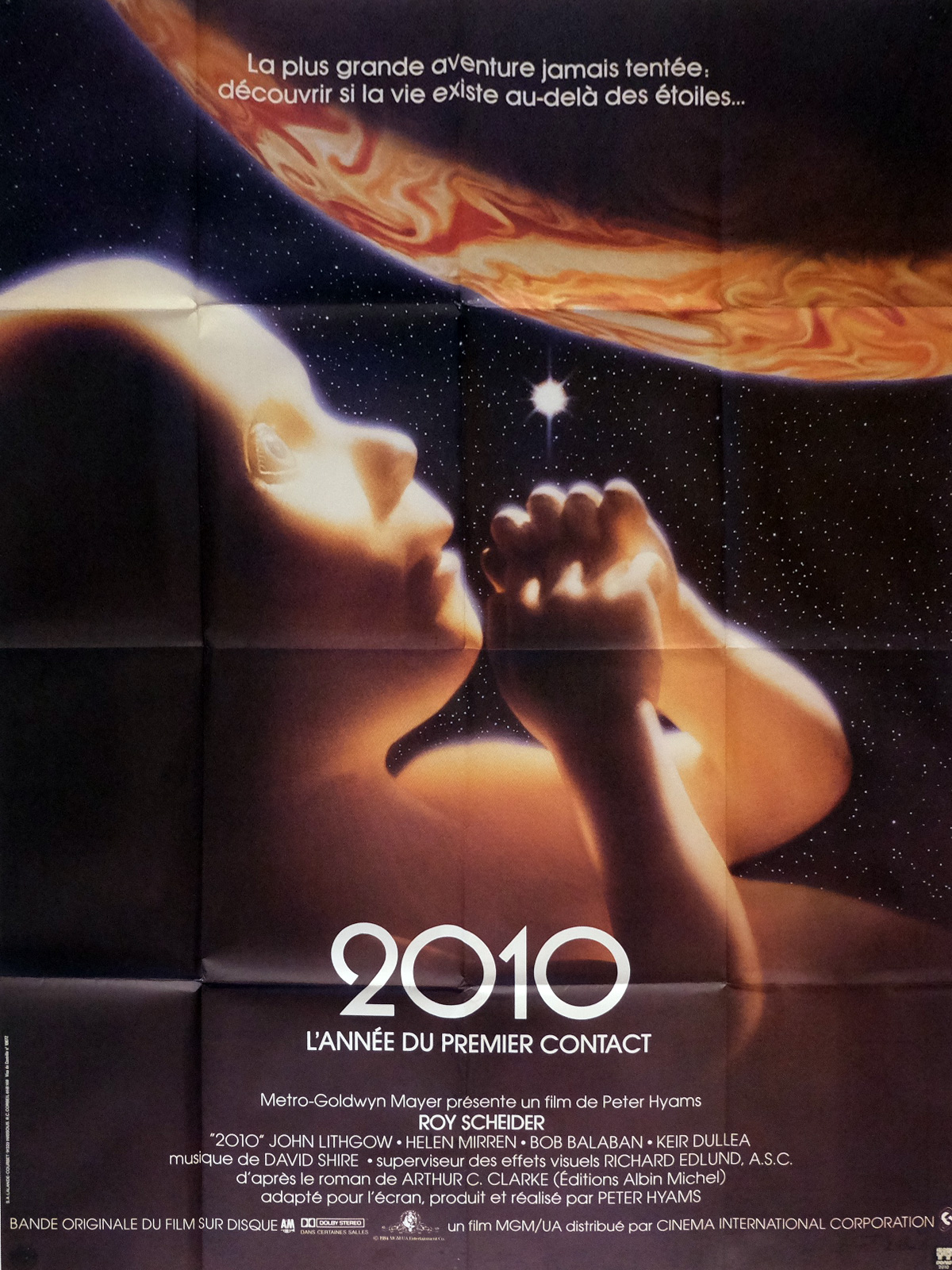 Si la mise en scène de Peter Hyams est plus classique que celle de Kubrick, tout comme sa narration, elle se fait efficace et très propre, bon point pour le film donc. Ensuite, le casting. Voilà bien là un des points forts du métrage, qui bénéficie d’un excellent casting, avec Roy Scheider (Les Dents de la Mer) en tête, crédible et intéressant, mais également John Lithgow (pas mal de De Palma, la saison 4 de Dexter) ou Helen Mirren (Hitchcock, The Queen, Excalibur). Suite de 2001, 2010 inclut forcément quelques personnages et donc acteurs du premier film. Keir Dullea reprend le rôle de Dave Bowman pour de courts instants, tandis que Douglas Rain prête de nouveau sa voix à HAL 9000, l’ordinateur de bord du Discovery. Autre point positif, 2010 contient quelques scènes à l’ambiance tendue, comme la première virée dans l’espace de John Lithgow et Elya Baskin, ou tout simplement son final. Par contre, ceux qui attendent des réponses claires et nettes concernant les événements du film et du coup, de 2001 risquent d’être déçus. Mais c’est aussi ce qui fait la force du métrage, et ce qui en fait un film de science fiction bien plus intéressant que de nombreux autres métrages du genre. Certains moments font clairement rêver ! Alors oui, je défends et défendrais toujours ce 2010, une suite souvent oubliée et surtout souvent boudée, voir une suite dont certains ignorent l’existence, et pourtant, une très bonne suite, différente certes, mais très bonne. Imparfaite certes, avec un début sans doute trop long sur Terre, mais rien que ne valent le coup de bouder le film.