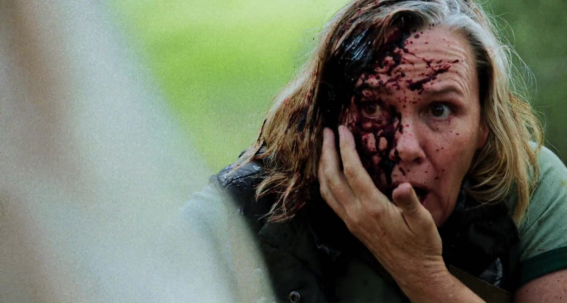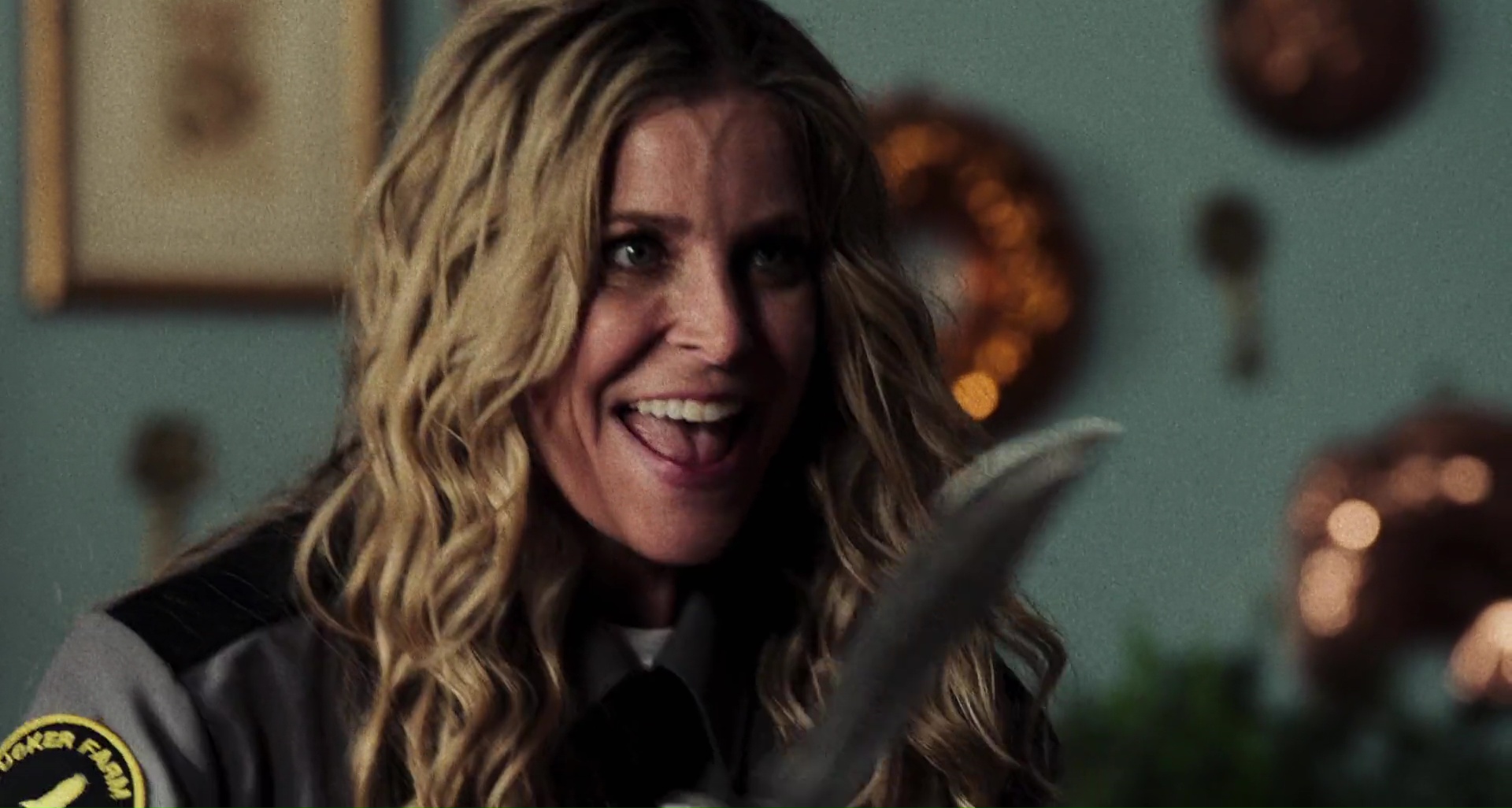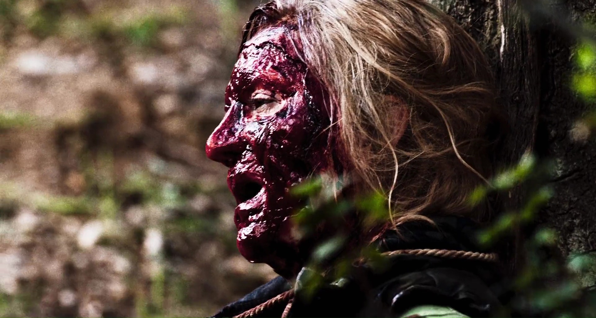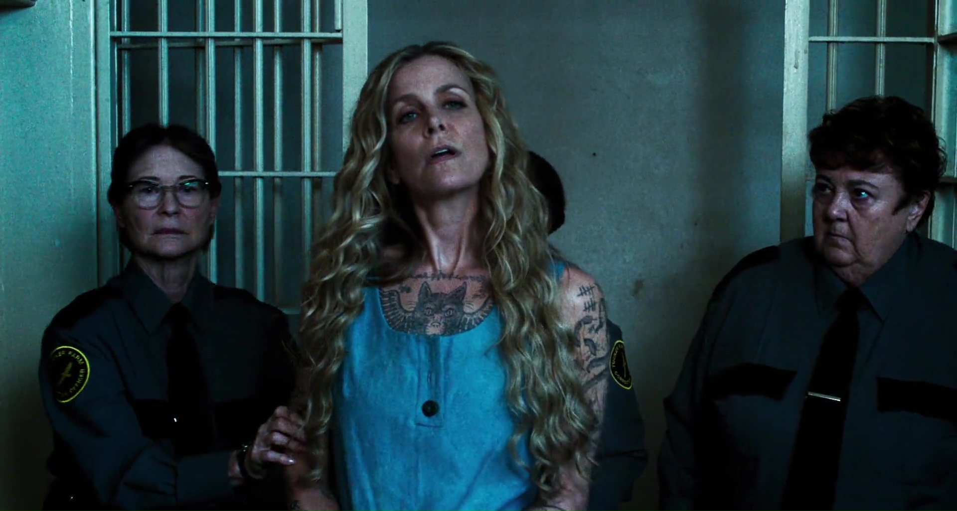 Plus de 20 balles dans le corps, un reportage à la télévision nous avertissant qu’ils sont miraculeusement en vie, et voilà, c’est tout, on passe à la suite. Zombie nous avait déjà fait le coup avec Halloween 2, mais c’était justement pour mieux s’affranchir de la saga originale et enfin faire ce qu’il voulait. Mais là, il annihile clairement la fin de l’opus précédent pour nous offrir un nouveau voyage, qui n’a pas grand-chose de nouveau à raconter, et n’est pas toujours le plus passionnant du monde, puisque se faisant une grosse redite du précédent opus justement. Découpé en deux parties, la première pourra plaire, malgré quelques moments over the top pas des plus crédibles. Baby et Otis sont en prison, on trouve Dee Wallace en gardienne de prison sadique, et le but ultime sera pour eux de sortir de prison. Otis aura l’aide du nouveau membre de la famille joué par Richard Brake, et ils vont devoir aider Baby à leur tour. On retrouve la violence sèche habituelle de Zombie, son style de mise en scène, et parfois, la sauce prend, même si elle ne prend aucun risque, donnant au spectateur qui sait dans quoi il se lance exactement ce qu’il veut. Beaucoup de scènes font clairement échos à The Devil’s Rejects, comme cette scène où plusieurs membres d’une famille sont en otage, et forcément, que certains seront brutalement assassinés, et que les femmes se retrouveront nues et humiliées. Ça crie, ça saigne, Zombie abuse du ralenti, de la caméra portée, le grain de l’image est comme à son habitude très prononcé, on a droit à quelques bonnes chansons, et Sheri Moon Zombie en profite pour jouer la folle comme elle ne l’a jamais fait, en accentuant tout, parfois en faisant mouche, parfois pas du tout tant le ridicule n’est pas loin. Son personnage semble finalement assez éloigné de sa précédente interprétation.