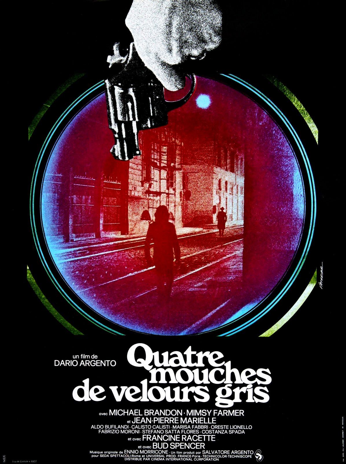 Dommage oui, car à côté, le métrage délivre quelques séquences clairement prenantes, et pas seulement dans ces meurtres. La scène du rendez-vous dans le jardin public est très bien menée, tandis que la scène où une jeune femme se cache dans une armoire contient un bon suspense, et se termine par quelques idées visuelles originales. Mais le rythme du métrage se retrouve totalement déséquilibré, entre ses bonnes idées, ses meurtres, ses moments à suspense, ces moments plus légers, et même quelques moments presque ridicules. Mais dans ce bordel pas forcément toujours bien organisé et surtout un brin bancal, il faut bien reconnaître que Argento parvient à surprendre, et donc par la même occasion, évite le défaut du Chat a Neuf Queues. Il n’ennuie pas. Certains moments sont longuets, mais toujours sauvés par l’instant suivant, soit par la réussite de ce qui arrive ou alors son improbabilité. Quand à l’identité du tueur, malheureusement, elle est également assez facile à deviner, mais ne débarque pas comme ça sans prévenir comme dans son précédent métrage. En tout cas, avec sa trilogie, Argento a suffisamment expérimenté pour bien savoir ce qui fonctionne et ce qui ne fonctionne pas, ce qui l’amènera, après l’échec de sa comédie Cinq Jours à Milan en 1973, à donner naissance aux Frissons de l’Angoisse en 1975. 4 Mouches de Velours Gris constitue par ailleurs également la dernière collaboration entre Argento et Morricone avant Le Syndrome de Stendhal en 1996, suite à un désaccord sur ce film.
