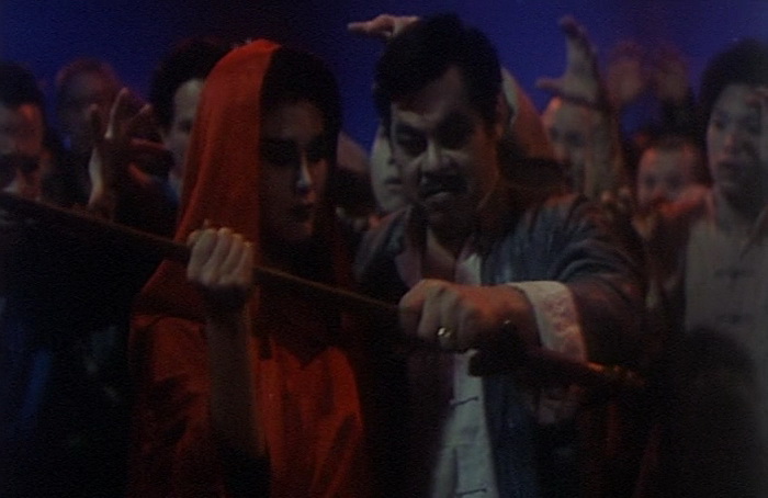 L’introduction nous avait pourtant mis en confiance, avec cette bande de moines ninjas qui affrontent une horde de morts vivants sur un chantier, dans laquelle on retrouvait certains codes de la ghost kung fu comedy. Mais rapidement, le film s’enlise. On sent de bonnes idées ici et là, mais on a surtout l’impression qu’ils ne savaient pas trop quoi faire de leur concept et qu’ils ont essayé de l’étoffer avec des scènes de comédies sincèrement peu inspirées… D’autant plus qu’on nous sort des mini intrigues (le personnage suivi par le fantôme de mariée) qui n’ont pas grand-chose à voir avec l’intrigue principale, accentuant encore plus cette impression de remplissage pour péniblement arriver à 1h25 génériques compris. Le film décolle à vingt minutes de la fin quand enfin il se lâche et qu’on retrouve la folie du cinéma fantastique HK. Alors ce n’est pas grandiose, entendons-nous là, mais après une première heure extrêmement laborieuse, on se console comme on peut. Un final qui part un peu dans le nawak, avec des filtres de couleurs dans tous les sens, des fumigènes bien kitchs, des fantômes vampires, un sèche-cheveux qui lance des éclairs, des bruitages cartoons, mais surtout un fun retrouvé qui ne nous donne pas l’impression d’avoir perdu 1h25 de notre vie (seulement 1h…). Peter Mak semble malgré tout faire ce qu’il peut avec ce très faible budget qui semble lui avoir été alloué, et bien que le film a ce charme désuet des productions HK de cette époque, il n’en demeure pas moins un moment parfois assez compliqué à passer, uniquement sauvé par un début réussi et un final qui part dans tous les sens.