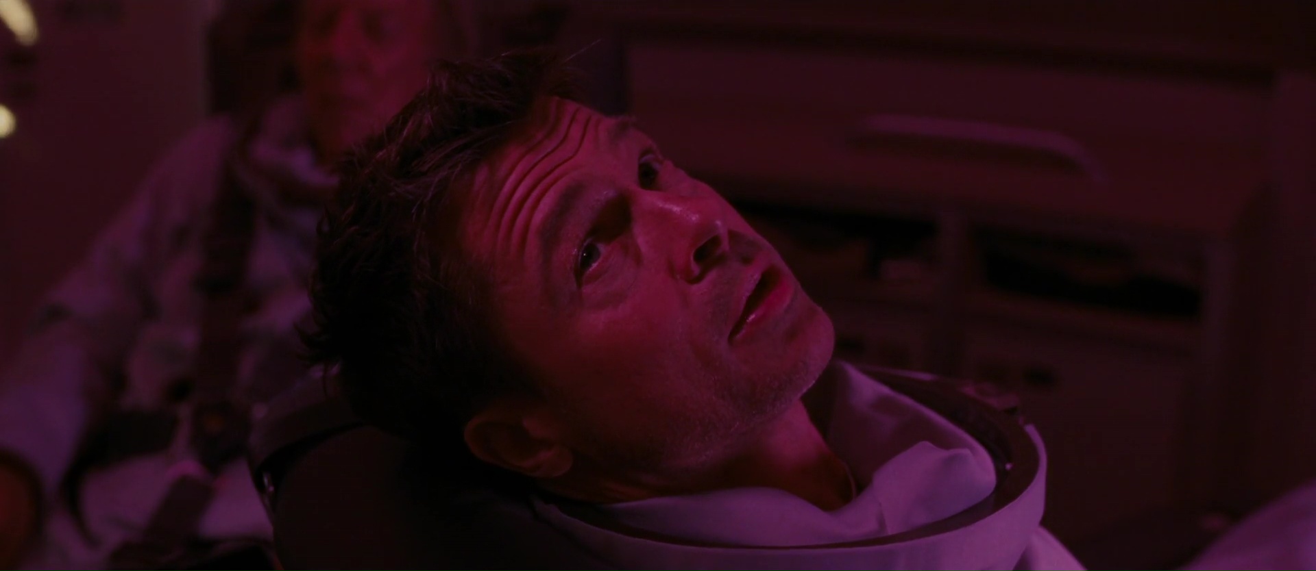 Y-a-t-il de la vie là-bas ? Ce n’est finalement pas le propos du film, et qu’il réponde ou non à la question, ça ne changera rien au film, qui met en avant Brad Pitt dans le rôle principal de Roy. Ad Astra est son voyage. Imparfait, mais pour peu que l’on rentre dans l’ambiance, hautement satisfaisant. De par sa beauté plastique bien évidemment, Ad Astra étant à tout point de vu sublime pour les yeux. Mais pas que. Sublime pour les yeux, sublime pour les oreilles (merci Max Richter, et merci le sublime morceau Says de Nils Frahm qui passe en boucle maintenant chez moi), mais en rentrant dans l’ambiance, sublime pour le ressenti. Car il y a, en effet, des défauts à ce Ad Astra. Des défauts qui pourraient s’avérer très gênant si on ne rentre pas dans la proposition de James Gray, et qui ne changera rien à l’appréciation de l’œuvre le cas contraire. Heureusement pour moi, je me suis pour le coup trouvé du bon côté. Après une scène d’ouverture tout bonnement impressionnante visuellement, on envoie Roy aux confins du système solaire. Enfin, sur Mars en réalité au début, avec un arrêt sur la Lune. Lune devenue un piège à touristes avec ses prix exorbitants. Il ne manquerait plus que les chauffeurs de taxi arnaqueurs aux portes de la station pour que je ne me sois cru revenu à Kiev en Ukraine. Blague à part, Ad Astra nous parle du long voyage de Roy, et un voyage, si tout se passe bien, ce n’est pas très impressionnant, ni intéressant, et le scénario lui met à intervalle régulier des bâtons dans les roues. Le souci, c’est qu’au final, beaucoup de ses soucis sont des petits défis, vite surmontés, peu crédibles par moment, et qui n’ont que peu d’incidence sur l’ensemble du récit. Une course poursuite sur la lune ? Une station abandonnée avec un possible élément hostile à l’intérieur ? La traversée d’un lieu dangereux pour infiltrer une navette ? Pas de souci pour ce brave Brad Pitt. Peu crédible par moment à l’écran, mais encore une fois, pour peu qu’on soit à fond dans le film et son ambiance, ça passe. Mieux, la maestria avec laquelle James Gray traite son film ferait tout passer.