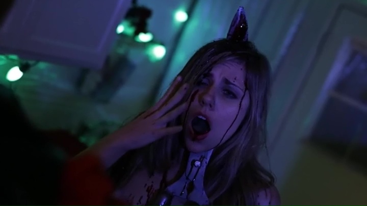 Et ça, c’est le sort souvent réservé aux femmes, tuées de manière gore avec giclées de sang XXL, car les hommes eux, c’est un coup de cisailles dans l’entre-jambe. Film de fan pour des fans qui ne demandent qu’à s’amuser avec un bon quota de meurtres, All Through the House s’amuse aussi avec tout ce qu’il peut, avec tous les clichés, mais en citant également quelques références, à la fois à d’autres films et aux légendes de Noël. Au détour d’un dialogue, la légende de Krampus sera abordée, on aura de multiples plans hommages aux slashers (et au giallo), avec le tueur apparaissait derrière ses victimes (et semblant se téléporter parfois, comme Jason dans les épisodes 7 et 8 de Vendredi 13), des gros plans sur les mains du tueur (comme dans un bon giallo), et bien entendu, de multiples pistes quand à l’identité du tueur. Et si cela s’avère au final bien tiré par les cheveux, on n’y fera pas franchement attention, car on s’amuse. Le métrage a bien compris ce que le spectateur attend d’un slasher : un peu de tension, beaucoup de meurtres, et un scénario simple ne voulant pas se faire plus intelligent qu’il ne devrait l’être.
