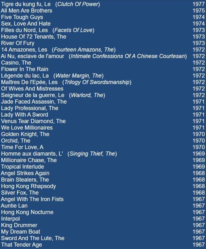 Pour Lily Ho, Angel With The Iron Fists marque ses grands débuts comme vedette glamour des Shaw. Ses prestations dans le mélodrame My Dream Boat et le musical Hong Kong Nocturne démontraient sa versatilité et auront consolidé sa position au sommet du star system des studios sur lequel elle resta perchée jusqu’à sa retraite en 1974. Lily Ho est apparue dans d’autres spy capers notamment une suite : Angel Strikes Again, de même que Brain Stealers, et Lady Professional. Vers la fin de sa carrière son rôle de courtisane vengeresse dans Intimate Confessions Of A Chinese Courtesan avait une étrange parenté avec celui de l’agent 009. Comme cette dernière, la courtisane devait séduire et duper ses adversaires pour mieux les détruire et parmi ces cibles l’on comptait une autre femme fatale vénéneuse. Comparer ce film de la maturité de l’actrice avec celui de ses débuts pourrait être un exercice intéressant pour quiconque s’intéresse au Studio Shaw Brothers et son évolution.
